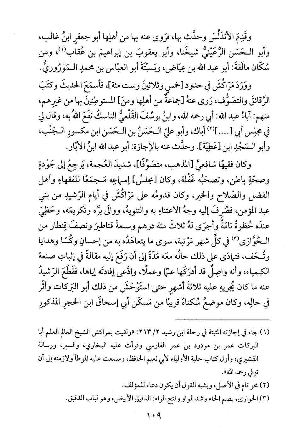 (¬1) جاء في إجازته المثبتة في رحلة ابن رشيد 2/ 213: "ولقيت بمراكش الشيخ العالم العلم أبا البركات عمر بن مودود بن عمر الفارسي وقرأت عليه البخاري، والسير، ورسالة القشيري، وأول كتاب حلية الأولياء لأبي نعيم الحافظ، وسمعت عليه الموطأ ولازمته إلى أن توفي رحمه الله".