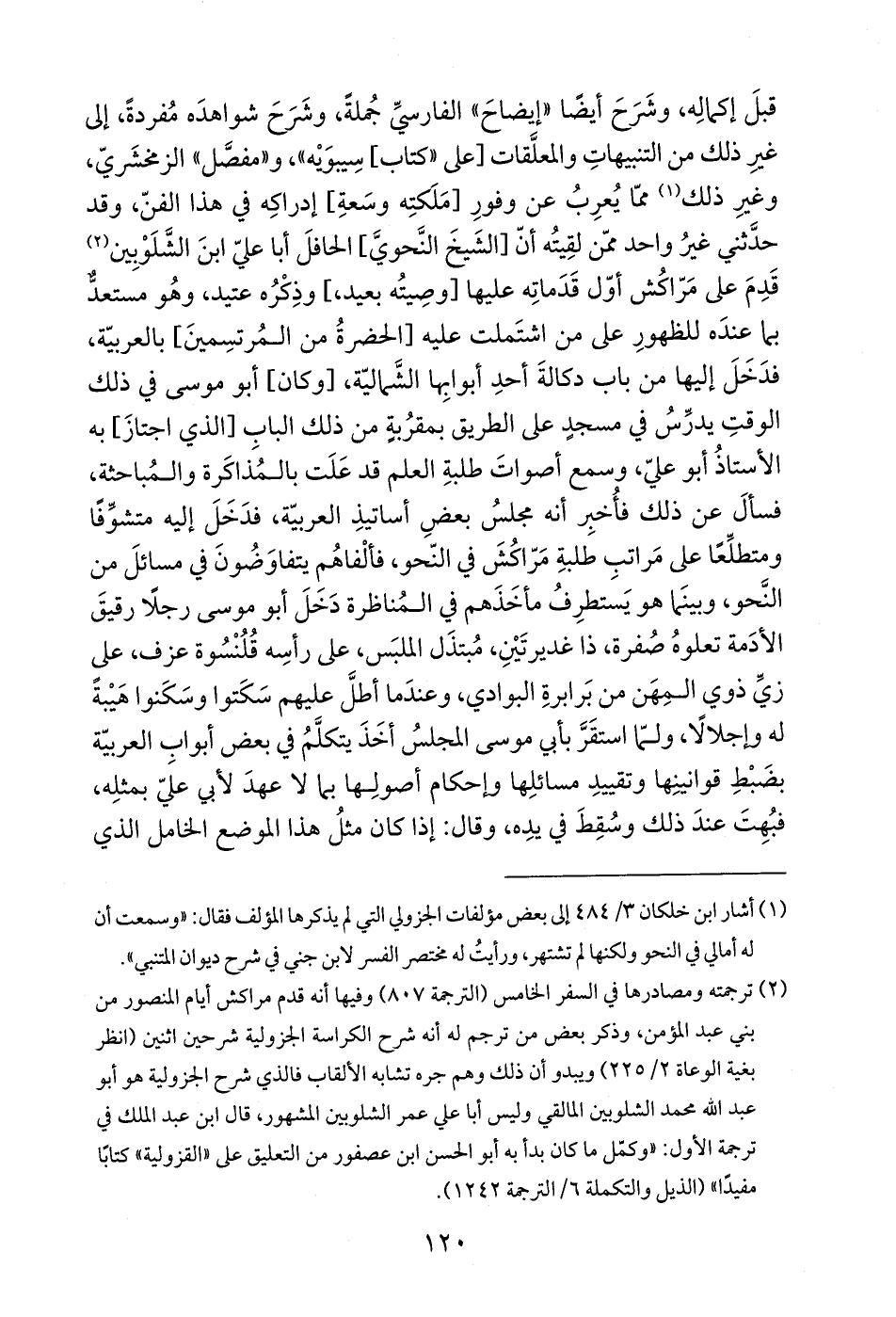 قبلَ إكمالِه، وشَرَحَ أيضًا "إيضاحَ" الفارسيِّ جُملةً، وشَرَحَ شواهدَه مُفردةً، إلى غيرِ ذلك من التنبيهاتِ والمعلَّقات [على "كتاب] سِيبوَيْه"، و"مفصَّل" الزمخشَريّ، وغيرِ ذلك (¬1) ممّا يُعرِبُ عن وفورِ [مَلَكتِه وسَعةِ] إدراكِه في هذا الفنّ، وقد حدَّثني غيرُ واحد ممّن لقِيتُه أنّ [الشَيخَ النَّحويَّ] الحافلَ أبا عليّ ابنَ الشَّلَوْبِين (¬2) قَدِمَ على مَرّاكُش أوّل قَدَماتِه عليها [وصِيتُه بعيد،] وذِكْرُه عتيد، وهُو مستعدٌّ بما عندَه للظهورِ على من اشتَملت عليه [الحضرةُ من المُرتسِمينَ] بالعربيّة، فدَخَلَ إليها من باب دكالةَ أحدِ أبوابِها الشَّماليّة، [وكان] أبو موسى في ذلك الوقتِ يدرِّسُ في مسجدٍ على الطريق بمقرُبةٍ من ذلك البابِ [الذي اجتازَ] به الأستاذُ أبو عليّ، وسمع أصواتَ طلبةِ العلم قد عَلَت بالمُذاكَرة والمُباحثة، فسألَ عن ذلك فأُخبِر أنه مجلسُ بعضِ أساتيذِ العربيّة، فدَخَلَ إليه متشوِّفًا ومتطلِّعًا على مَراتب طلبةِ مَرّاكُشَ في النّحو، فألْفاهُم يتفاوَضُونَ في مسائلَ من النَّحو، وبينَما هو يَسَتطرِفُ مأخَذَهم في المُناظرة دَخَلَ أبو موسى رجلًا رقيقَ الأدَمة تعلوهُ صُفرة، ذا غديرتَيْنِ، مُبتذَل الملبَس، على رأسِه قُلُنْسُوة عزف، على زيِّ ذوي المِهَن من بَرابرةِ البوادي، وعندَما أطلَّ عليهم سَكَتوا وسَكَنوا هَيْبةً له وإجلالًا، ولمّا استقَرَّ بأبي موسى المجلسُ أخَذَ يتكلَّمُ في بعض أبوابِ العربيّة بضَبْطِ قوانينِها وتقييدِ مسائلِها وإحكام أصولِها بما لا عهدَ لأبي عليّ بمثلِه، فبُهِتَ عندَ ذلك وسُقِطَ في يدِه، وقال: إذا كان مثلُ هذا الموضع الخامل الذي