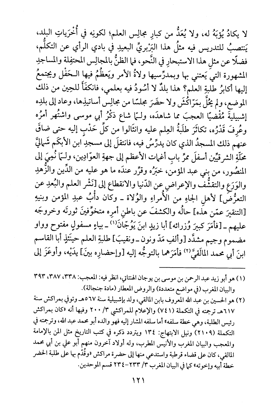 لا يكادُ يُؤبَهُ له، ولا يُعَدُّ من كبارِ مجالِس العلم؛ لكونِه في أُخْرَياتِ البلد، يَنتصبُ للتدريس فيه مثلُ هذا البَرْبريِّ البعيدِ في بادي الرأي عن التكلُّم، فضلًا عن مثلِ هذا الاستبحارِ في النَّحو، فما الظنُّ بالمجالِس المحتفِلة والمساجدِ المشهورة التي يَعتني بها وبمدرِّسيها ولاةُ الأمر ويَعظُمُ فيها الحَفْل ويجتمعُ إليها أكابرُ طلبةِ العلم؟ هذا بلدٌ لا أسُودُ فيه بعلمي، فانكفَأَ للحِين من ذلك الموضع، ولم يحُلَّ بمَرّاكُشَ ولا حضَرَ مجلسًا من مجالِس أساتيذِها، وعاد إلى بلدِه إشبيليةَ مُقْضيًا العجبَ مما شاهدَه، ولمّا شاع ذكْرُ أبي موسى واشتُهر أمرُه وعُرِفَ قَدْرُه، تكاثَرَ طلَبةُ العِلم عليه وانثَالوا من كلِّ حَدْبٍ إليه حتى ضاقَ عنهم ذلك المسجدُ الذي كان يدرِّسُ فيه، فانتقلَ إلى مسجدِ ابن الأبكَم شَماليَّ محَلّةِ الشرقيِّين أسفلَ ممرِّ بابِ أغمات الأعظم إلى جهةِ العوّادِين، ولمّا نُمِيَ إلى المنصور، من بني عبد المؤمن، خبَرُه وقرِّر عندَه ما هو عليه من الدِّين والزُّهدِ والوَرَعِ والتقشُّف والإعراضِ عن الدّنيا والانقطاع إلى [نَشْر العلم والبُعدِ عن التعرُّض] لأهلِ الجاهِ من الأُمراءِ والوُلاة - وكان دأْبُ عبدِ المؤمن وبنيهِ [التنقيرَ عمّن هذه] حالُه والكشفَ عن باطنِ أمرِه متخوِّفينَ ثورتَه وخروجَه عليهم -[فأمَرَ كبيرَ وُزرائه] أبا زيدِ ابنَ يَوُجّانَ (¬1) - بياءٍ مسفولٍ مفتوح وواو مضموم وجيم مشدَّد [وألفِ مَدّ ونون - ونقيبَ] طلبةِ العلم حينَئذٍ أبا القاسم ابنَ أبي محمد المالَقيَّ (¬2) فأمَرَهما بالتوجّه إليه [وإحضارِه بينَ] يدَيْه، وأوعَزَ إلى
