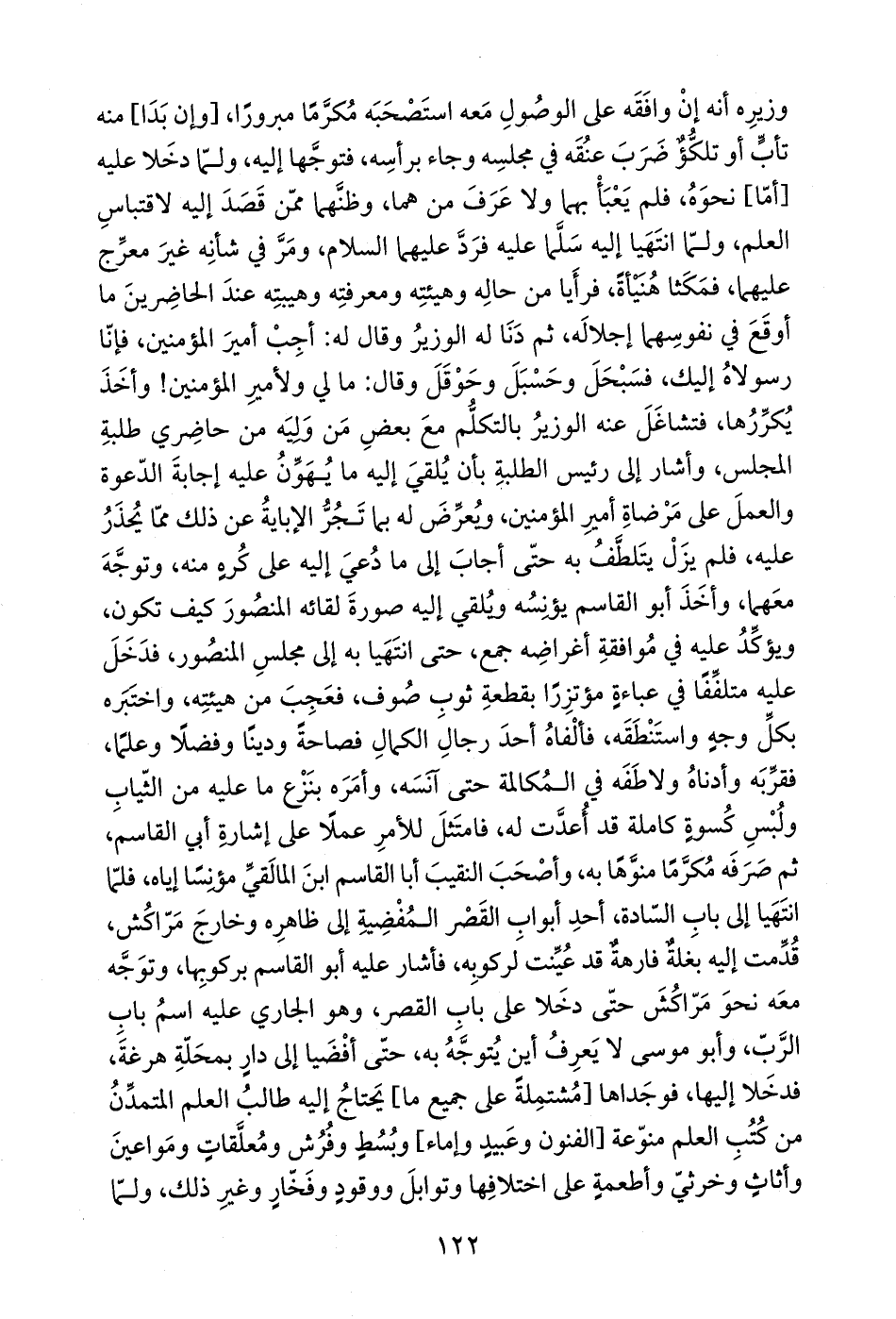 وزيرِه أنه إنْ وافَقَه على الوصُولِ مَعه استَصْحَبَه مُكرَّمًا مبرورًا، [وإن بَدَا] منه تأبٍّ أو تلكُّؤٌ ضَرَبَ عنُقَه في مجلسِه وجاء برأسِه، فتوجَّها إليه، ولمّا دخَلا عليه [أمّا] نحوَهُ، فلم يَعْبَأْ بهما ولا عَرَفَ من هما، وظنَّهما ممّن قَصدَ إليه لاقتباسِ العلم، ولمّا انتَهَيا إليه سَلَّما عليه فرَدَّ عليهما السلام، ومَرَّ في شأنِه غيرَ معرِّج عليهما، فمَكَثا هُنَيْأةً، فرأَيا من حالِه وهيئتِه ومعرفتِه وهيبتِه عندَ الحاضِرينَ ما أوقَعَ في نفوسِهما إجلالَه، ثم دَنَا له الوزيرُ وقال له: أجِبْ أميرَ المؤمنين، فإنّا رسولاهُ إليك، فسَبْحَلَ وحَسْبَلَ وحَوْقَلَ وقال: ما لي ولأميِر المؤمنين! وأخَذَ يُكرِّرُها، فتشاغَلَ عنه الوزيرُ بالتكلُّم معَ بعضِ مَن وَليَه من حاضِري طلبةِ المجلس، وأشار إلى رئيس الطلبةِ بأن يُلقيَ إليه ما يُهَوِّنُ عليه إجابةَ الدّعوة والعملَ على مَرْضاةِ أميرِ المؤمنين، ويُعرِّضَ له بما تَجُرُّ الإبايةُ عن ذلك ممّا يُحذَرُ عليه، فلم يزَلْ يتَلطَّفُ به حتّى أجابَ إلى ما دُعيَ إليه على كُرهٍ منه، وتوجَّهَ معَهما، وأخَذَ أبو القاسم يؤنِسُه ويُلقي إليه صورةَ لقائه المنصُورَ كيف تكون، ويؤكِّدُ عليه في مُوافقةِ أغراضِه جمع، حتى انتَهَيا به إلى مجلسِ المنصُور، فدَخَلَ عليه متلفِّفًا في عباءةٍ مؤتزِرًا بقطعةِ ثوب صُوف، فعَجِبَ من هيئتِه، واختَبَره بكلِّ وجهٍ واستَنْطَقَه، فألْفاهُ أحدَ رجالِ الكمالِ فصاحةً ودينًا وفضلًا وعلمًا، فقرِّبَه وأدناهُ ولاطَفَه في المُكالمة حتى آنَسَه، وأمَرَه بنَزْع ما عليه من الثّيابِ ولُبْسِ كُسوةٍ كاملة قد أُعدَّت له، فامتَثلَ للأمرِ عملًا على إشارةِ أبي القاسم، ثم صَرَفَه مُكرَّمًا منوَّهًا به، وأصْحَبَ النقيبَ أبا القاسم ابنَ المالَقيِّ مؤنِسًا إياه، فلمّا انتَهَيا إلى باب السّادة، أحدِ أبوابِ القَصْر المُفْضِيةِ إلى ظاهرِه وخارجَ مَرّاكُش، قُدِّمت إليه بَغلةٌ فارهةٌ قد عُيِّنت. لركوبِه، فأشار عليه أبو القاسم بركوبِها، وتوَجَّه معَه نحوَ مَرّاكُشَ حتّى دخَلا على بابِ القصر، وهو الجاري عليه اسمُ بابِ الرَّبّ، وأبو موسى لا يَعرِفُ أين يُتوجَّهُ به، حتّى أفْضَيا إلى دارٍ بمحَلّةِ هرغةَ، فدخَلا إليها، فوجَداها [مُشتمِلةً على جميع ما] يَحتاجُ إليه طالبُ العلم المتمدِّنُ من كُتُبِ العلم منوّعة [الفنون وعَبيدٍ وإماء] وبُسُطٍ وفُرُش ومُعلَّقاتٍ ومَواعينَ وأثاثٍ وخرثيّ وأطعمةٍ على اختلافِها وتوابلَ ووقودٍ وفَخّارٍ وغيرِ ذلك، ولمّا