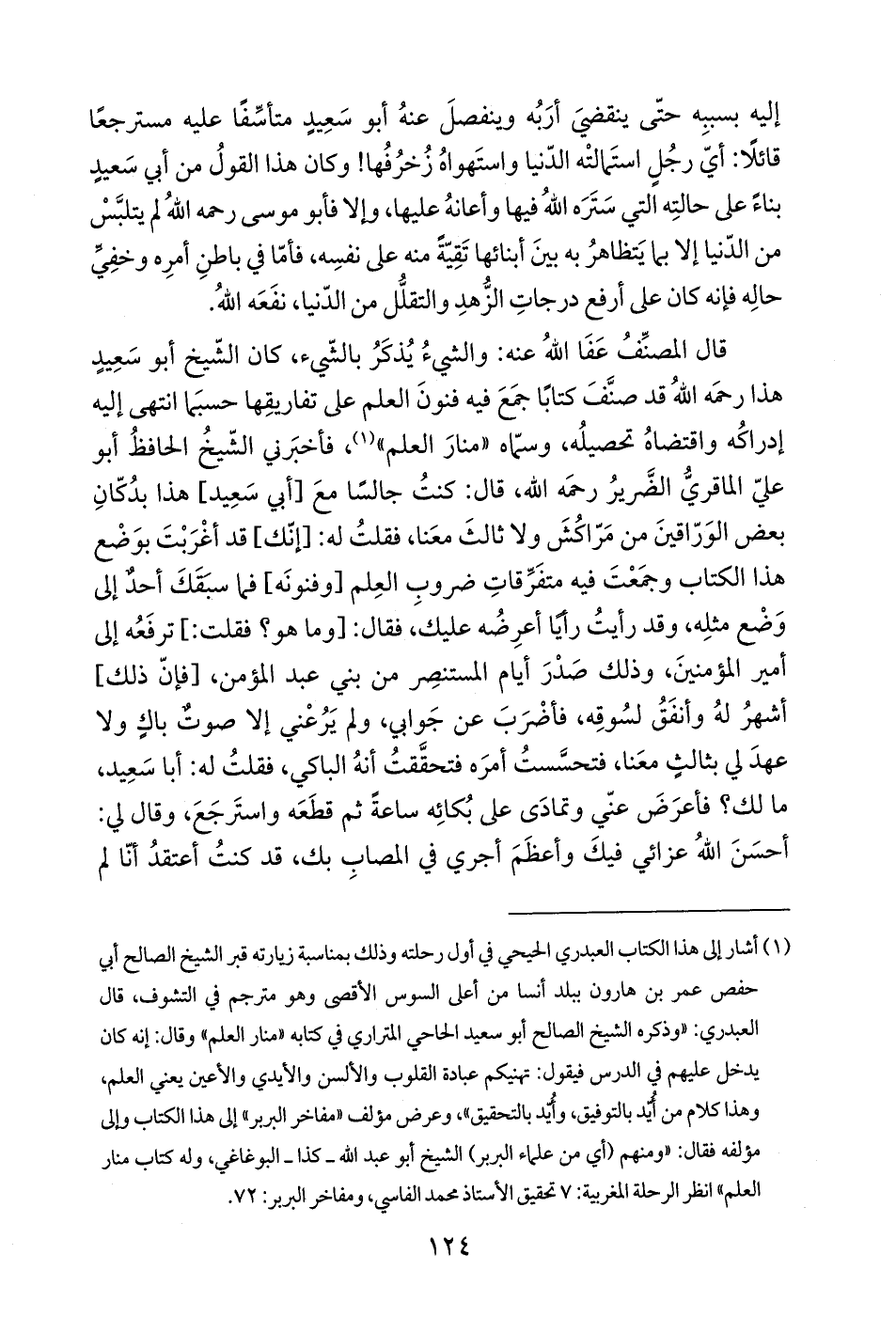 (¬1) أشار إلى هذا الكتاب العبدري الحيحي في أول رحلته وذلك بمناسبة زيارته قبر الشيخ الصالح أبي حفص عمر بن هارون ببلد أنسا من أعلى السوس الأقصى وهو مترجم في التشوف، قال العبدري: "وذكره الشيخ الصالح أبو سعيد الحاحي المتراري في كتابه "منار العلم" وقال: إنه كان يدخل عليهم في الدرس فيقول: تهنيكم عبادة القلوب والألسن والأيدي والأعين يعني العلم، وهذا كلام من أُيّد بالتوفيق، وأُيّد بالتحقيق"، وعرض مؤلف "مفاخر البربر" إلى هذا الكتاب وإلى مؤلفه فقال: "ومنهم (أي من علماء البربر) الشَّيخ أبو عبد الله -كذا- البوغاغي، وله كتاب منار العلم" انظر الرحلة المغربية: 7 تحقيق الأستاذ محمد الفاسي، ومفاخر البربر: 72.