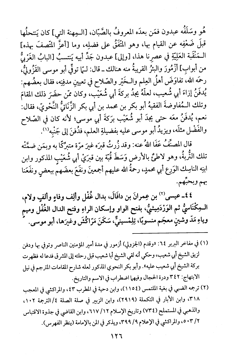 44 - عيسى (¬2) بن عِمرانَ بن دافَالَ، بدال غُفْل وألِف وفاءٍ وألفٍ ولام، المِكْنَاسيُّ ثم الوَرْدَمِيشيُّ، بفتح الواو وإسكان الراءِ وفتح الدال الغُفْل وميمٍ وياءِ مَدّ وشينٍ معجَم منسوبًا، تِلِمْسينيٌّ، سَكَنَ مَرّاكُشَ وغيرَها، أبو موسى.