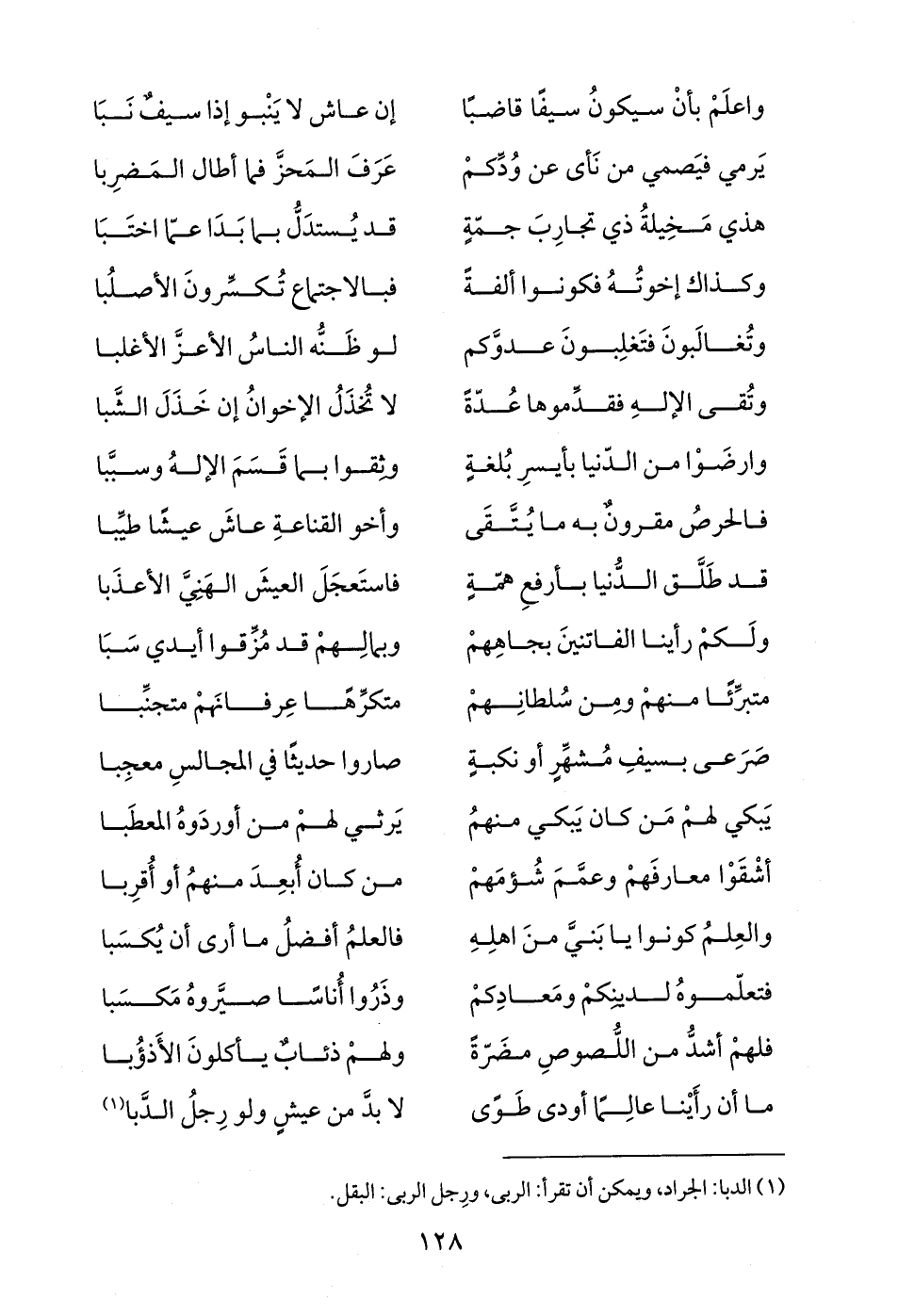 فتعلّموهُ لدينِكمْ ومَعادِكمْ ... وذَرُوا أُناسًا صيَّروهُ مَكسَبا