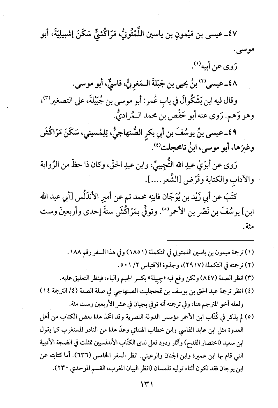 49 - عيسى بنُ يوسُفَ بن أبي بكرٍ الصُّنهاجيُّ، تِلِمْسيني، سَكَنَ مَرّاكُشَ وغيرَها، أبو موسى، ابنُ تامحجلت (¬4).