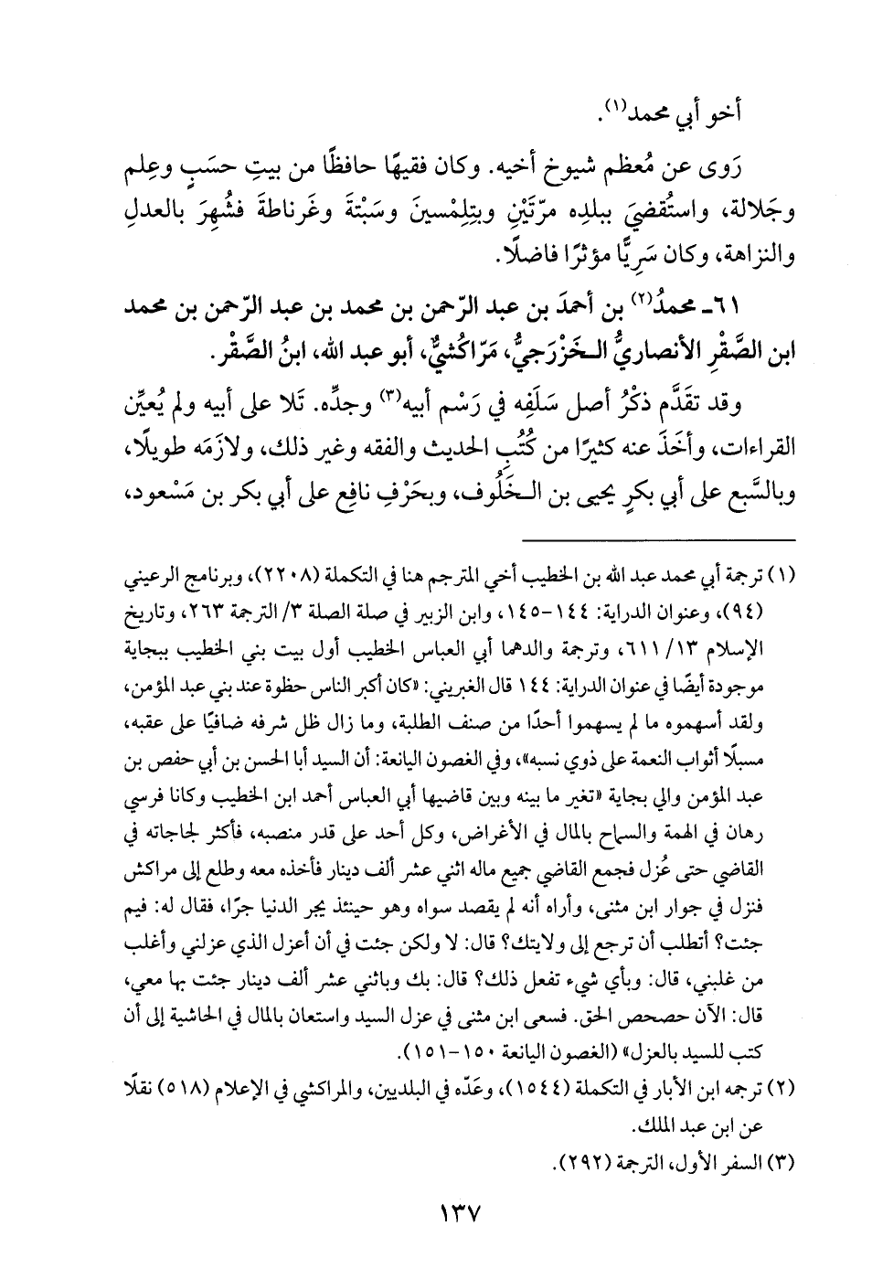 61 - محمدُ (¬2) بن أحمدَ بن عبد الرّحمن بن محمد بن عبد الرّحمن بن محمد ابن الصَّقْرِ الأنصاريُّ الخَزْرَجيُّ، مَرّاكُشيٌّ، أبو عبد الله، ابنُ الصَّقْر.