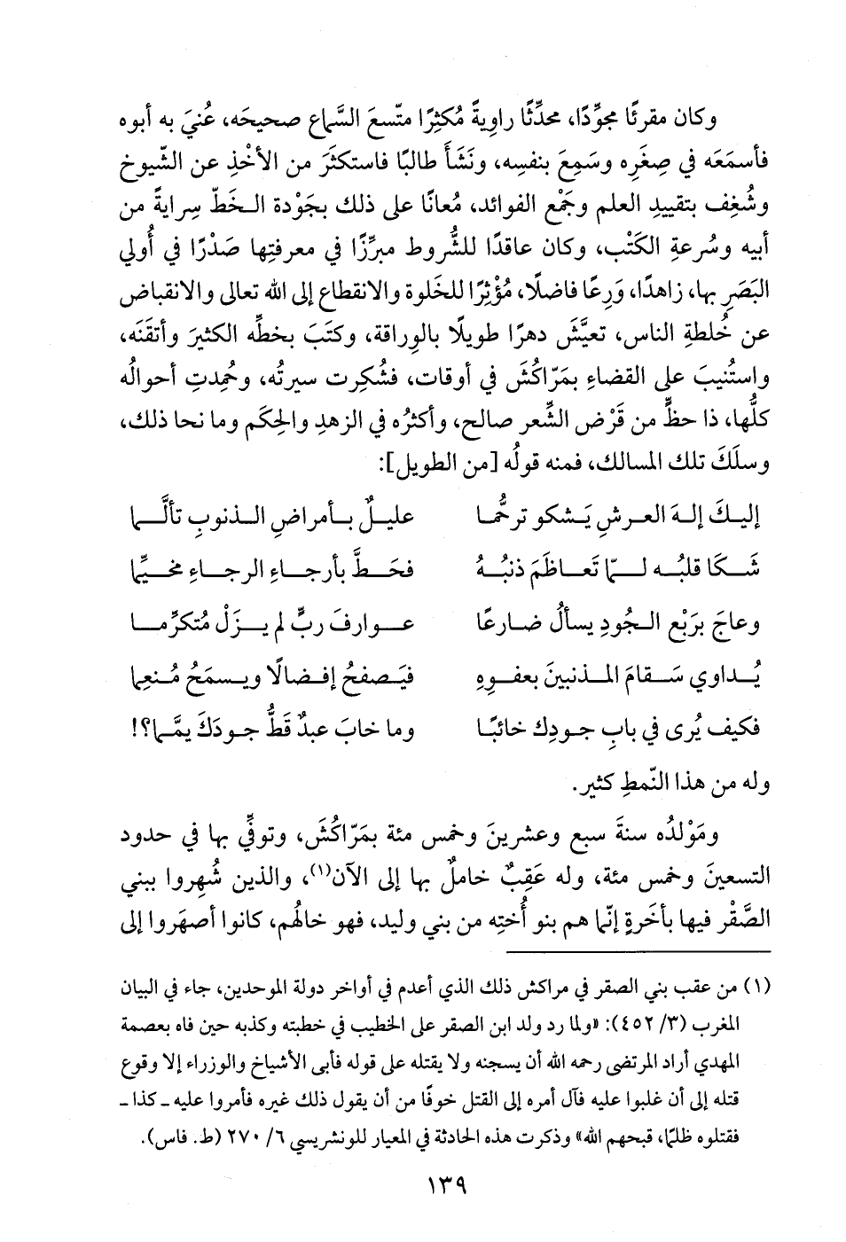 وكان مقرئًا مجوِّدًا، محدِّثًا راوِيةً مُكثِرًا متّسعَ السَّماع صحيحَه، عُنيَ به أبوه فأسمَعَه في صِغَرِه وسَمِعَ بنفسِه، ونَشَأَ طالبًا فاستكثَرَ من الأخْذِ عن الشّيوخ وشُغِف بتقييدِ العلم وجَمْع الفوائد، مُعانًا على ذلك بجَوْدة الخَطّ سِرايةً من أبيه وسُرعةِ الكَتْب، وكان عاقدًا للشُّروط مبرِّزًا في معرفتِها صَدْرًا في أُولي البَصَرِ بها، زاهدًا، وَرِعًا فاضلًا، مُؤْثِرًا للخَلوة والانقطاع إلى الله تعالى والانقباض عن خُلطةِ الناس، تعيَّشَ دهرًا طويلًا بالوِراقة، وكتَبَ بخطِّه الكثيرَ وأتقَنَه، واستُنيبَ على القضاءِ بمَرّاكُشَ في أوقات، فشُكِرت سيرتُه، وحُمِدتِ أحوالُه كلُّها، ذا حظٍّ من قَرْض الشِّعر صالح، وأكثرُه في الزهدِ والحِكَم وما نحا ذلك، وسلَكَ تلك المسالك، فمنه قولُه [من الطويل]: