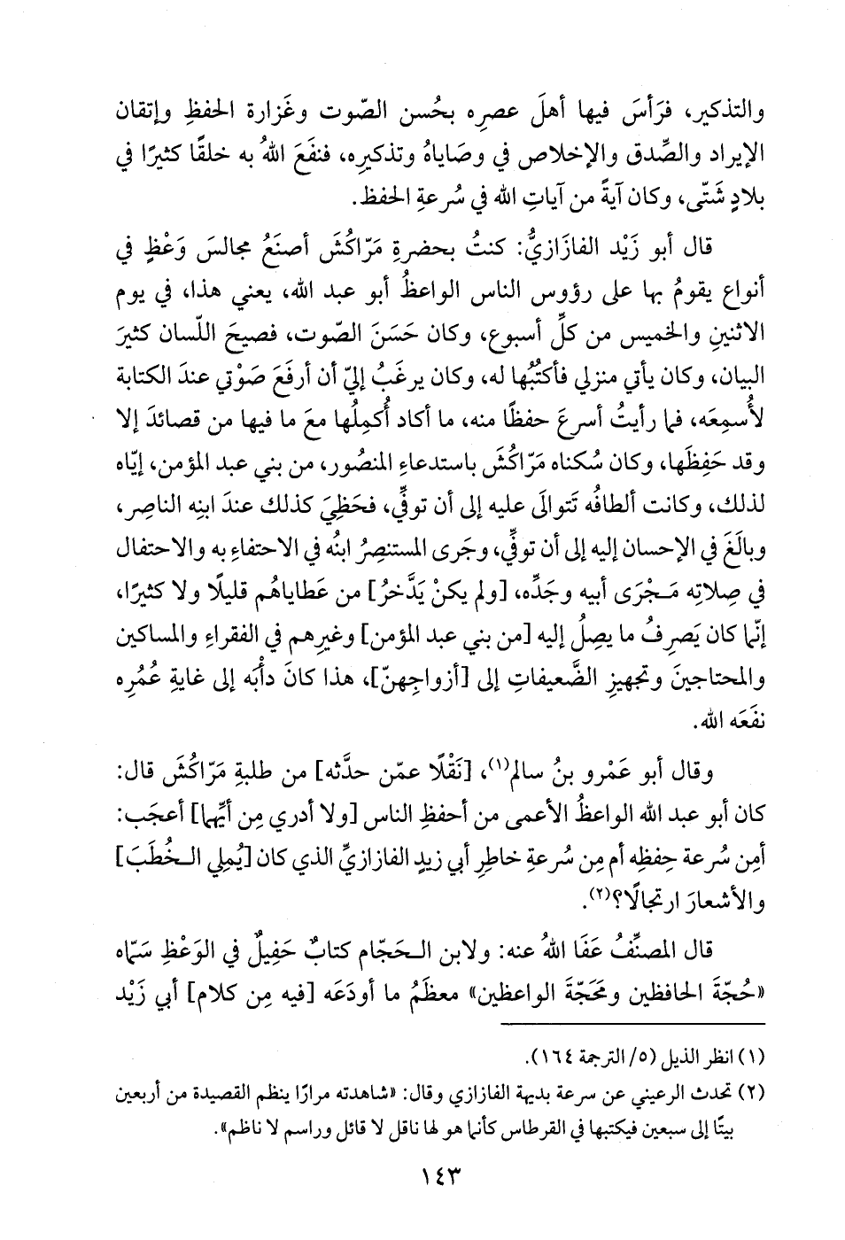 وقال أبو عَمْرو بنُ سالم (¬1)، [نَقْلًا عمّن حدَّثه] من طلبةِ مَرّاكُشَ قال: كان أبو عبد الله الواعظُ الأعمى من أحفظِ الناس [ولا أدري مِن أيِّهما] أعجَب: أمِن سُرعة حِفظِه أم مِن سُرعةِ خاطِرِ أبي زيدٍ الفازازيِّ الذي كان [يُمِلي الخُطَبَ] والأشعارَ ارتجالًا؟ (¬2).