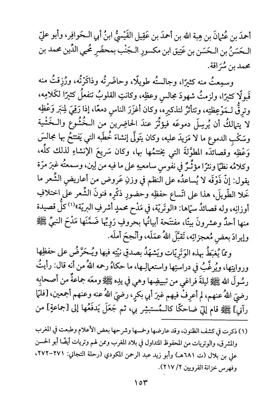 (¬1) ذكرت في كشف الظنون، وقد عارضها وخمسها وشرحها بعض الأعلام وطبعت في المغرب والمشرق، والوتريات من المحفوظ المتداول في بلاد المغرب وممن لهم وتريات أيضًا أبو الحسن علي بن بلال (ت 681 هـ) وأبو زيد عبد الرحمن المكودي (رحلة التجاني: 271 - 272، وفهرس خزانة القرويين 2/ 217).