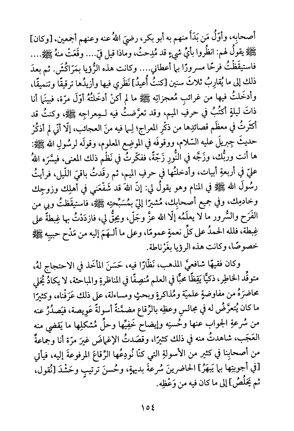 أصحابِه، وأوّلُ مَن بَدَأَ منهم به أبو بكر، رضيَ اللهُ عنه وعنهم أجمعين، [وكان]- صلى الله عليه وسلم - يقولُ لهم: انظُروا بأيِّ شيءٍ قد مُدِحتُ، وماذا قيل فيّ .... وقَعَتْ منهُ - صلى الله عليه وسلم - .... فاستيقَظْتُ فرحًا مسرورًا بما أعطاني .... وكانت هذه الرُّؤيا بمَرّاكُشَ. ثم بعدَ ذلك إلى ما يُقارِبُ ثلاثَ سنين [كنتُ أُعيدُ] نَظَري فيها وأزيدُها ترقيقًا وتنميقًا، وأدخَلتُ فيها من غرائبِ مُعجزاتِه - صلى الله عليه وسلم - ما لم أكنْ أدخَلتُهُ أوّلَ مرّة، فبينَما أنا ذاتَ ليلةٍ أكتُبُ في حرفِ الميم، وقد تعرَّضتُ فيه لمِعراجِه - صلى الله عليه وسلم -، وكنتُ قد أكثرَتُ في معظَم قصائدِها من ذكْرِ المعراج؛ لِما فيه منَ العجائب، إلّا أنّي لم أذكُرْ حديثَ جِبريلَ عليه السّلام، ووقوفَه في الموضِع المعلوم، وقولَه لرسُولِ الله - صلى الله عليه وسلم -: ها أنت وربُّك، وزَجَّه في النُّورِ زَجّةً، ففكّرتُ في نَظْم ذلك المعنى، فيسَّرَه اللهُ عليّ في أربعةِ أبيات، وأدخلتُها في حرفِ الميم، ثم رقَدتُ باقيَ اللّيل، فرأيتُ رسُولَ الله - صلى الله عليه وسلم - في المنام وهو يقولُ لي: إنّ اللهَ قد شَفّعَني في أهلِك وزوجِك وخادمِك، وفي جميع أصحابِك، مُشيرًا إليّ بمُسَبِّحتِه - صلى الله عليه وسلم -، فاستيقَظتُ وبي من الفَرَح والسُّرور ما لا يعلَمُه إلّا الله عزَّ وجَلّ، ويحِقُّ لي، فازدَدْتُ بها غِبطةً على غِبطة، فلله الحمدُ على كلِّ نعمةٍ عمومًا، وعلى ما ألهَمَ إليه من مَدْح حبيبِه - صلى الله عليه وسلم - خصوصًا، وكانت هذه الرؤيا بغَرْناطة.