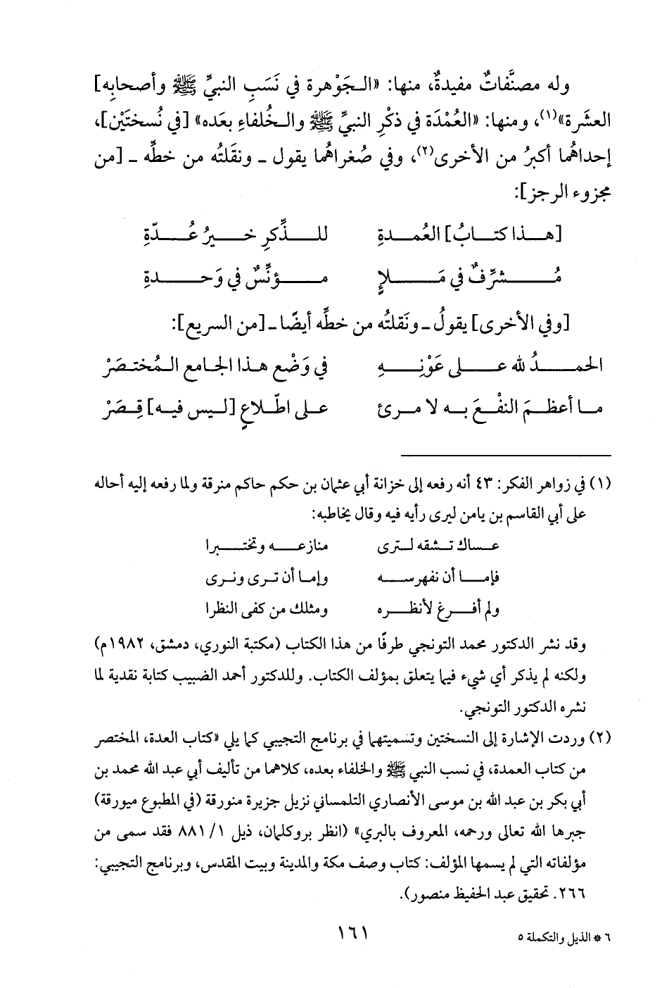 (¬2) وردت الإشارة إلى النسختين وتسميتهما في برنامج التجيبي كما يلي "كتاب العدة، المختصر من كتاب العمدة، في نسب النبي - صلى الله عليه وسلم - والخلفاء بعده، كلاهما من تأليف أبي عبد الله محمد بن أبي بكر بن عبد الله بن موسى الأنصاري التلمساني نزيل جزيرة منورقة (في المطبوع ميورقة) جبرها الله تعالى ورحمه، المعروف بالبري" (انظر بروكلمان، ذيل 1/ 881 فقد سمى من مؤلفاته التي لم يسمها المؤلف: كتاب وصف مكة والمدينة وبيت المقدس، وبرنامج التجيبي: 266. تحقيق عبد الحفيظ منصور).