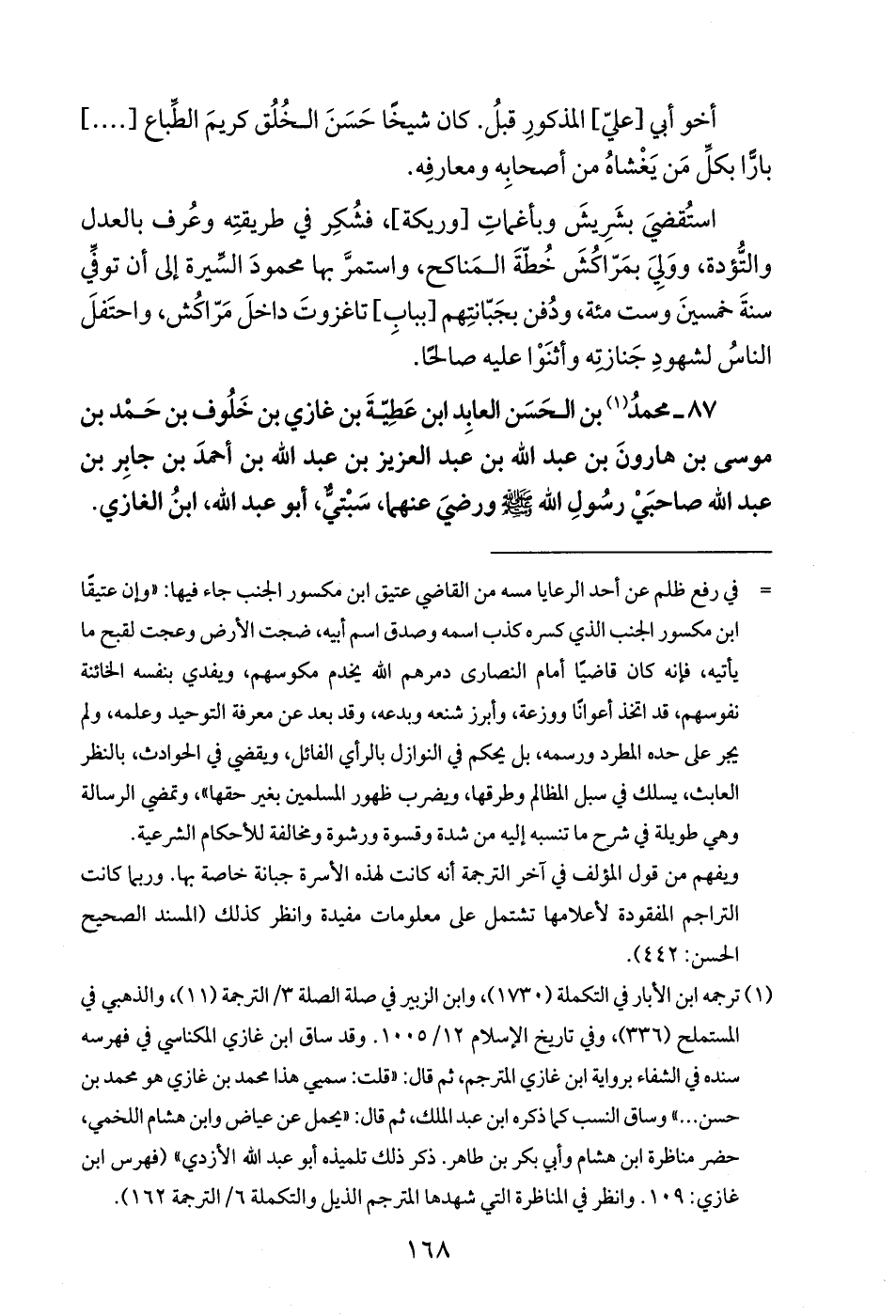 87 - محمدُ (¬1) بن الحَسَن العابِد ابن عَطِيّةَ بن غازي بن خَلُوف بن حَمْد بن موسى بن هارونَ بن عبد الله بن عبد العزيز بن عبد الله بن أحمدَ بن جابِر بن عبد الله صاحبَيْ رسُولِ الله - صلى الله عليه وسلم - ورضيَ عنهما، سَبْتيٌّ، أبو عبد الله، ابنُ الغازي.