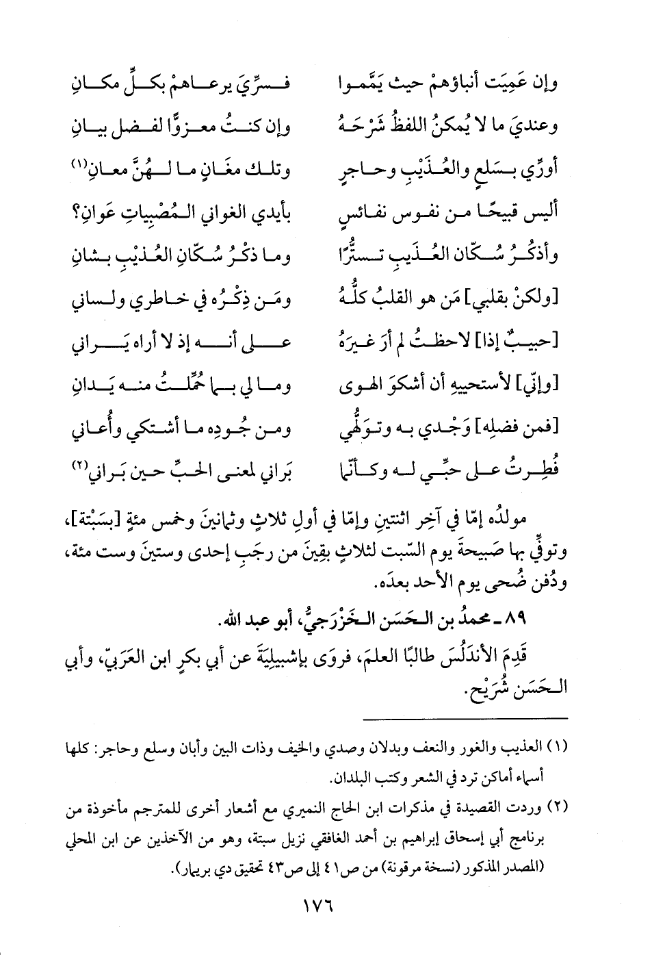 (¬2) وردت القصيدة في مذكرات ابن الحاج النميري مع أشعار أخرى للمترجم مأخوذة من برنامج أبي إسحاق إبراهيم بن أحمد الغافقي نزيل سبتة، وهو من الآخذين عن ابن المحلي (المصدر المذكور (نسخة مرقونة) من ص 41 إلى ص 43 تحقيق دي بريمار).
