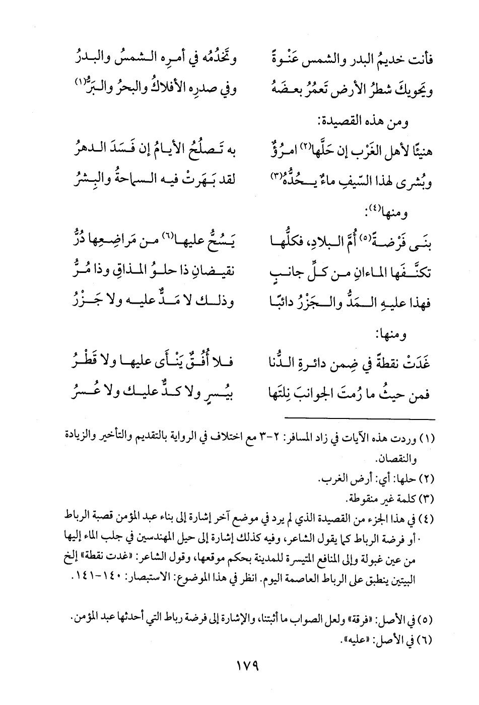 (¬4) في هذا الجزء من القصيدة الذي لم يرد في موضع آخر إشارة إلى بناء عبد المؤمن قصبة الرباط أو فرضة الرباط كما يقول الشاعر، وفيه كذلك إشارة إلى حيل المهندسين في جلب الماء إليها من عين غبولة وإلى المنافع المتيسرة للمدينة بحكم موقعها، وقول الشاعر: "غدت نقطة" إلخ البيتين ينطبق على الرباط العاصمة اليوم. انظر في هذا الموضوع: الاستبصار: 140 - 141.