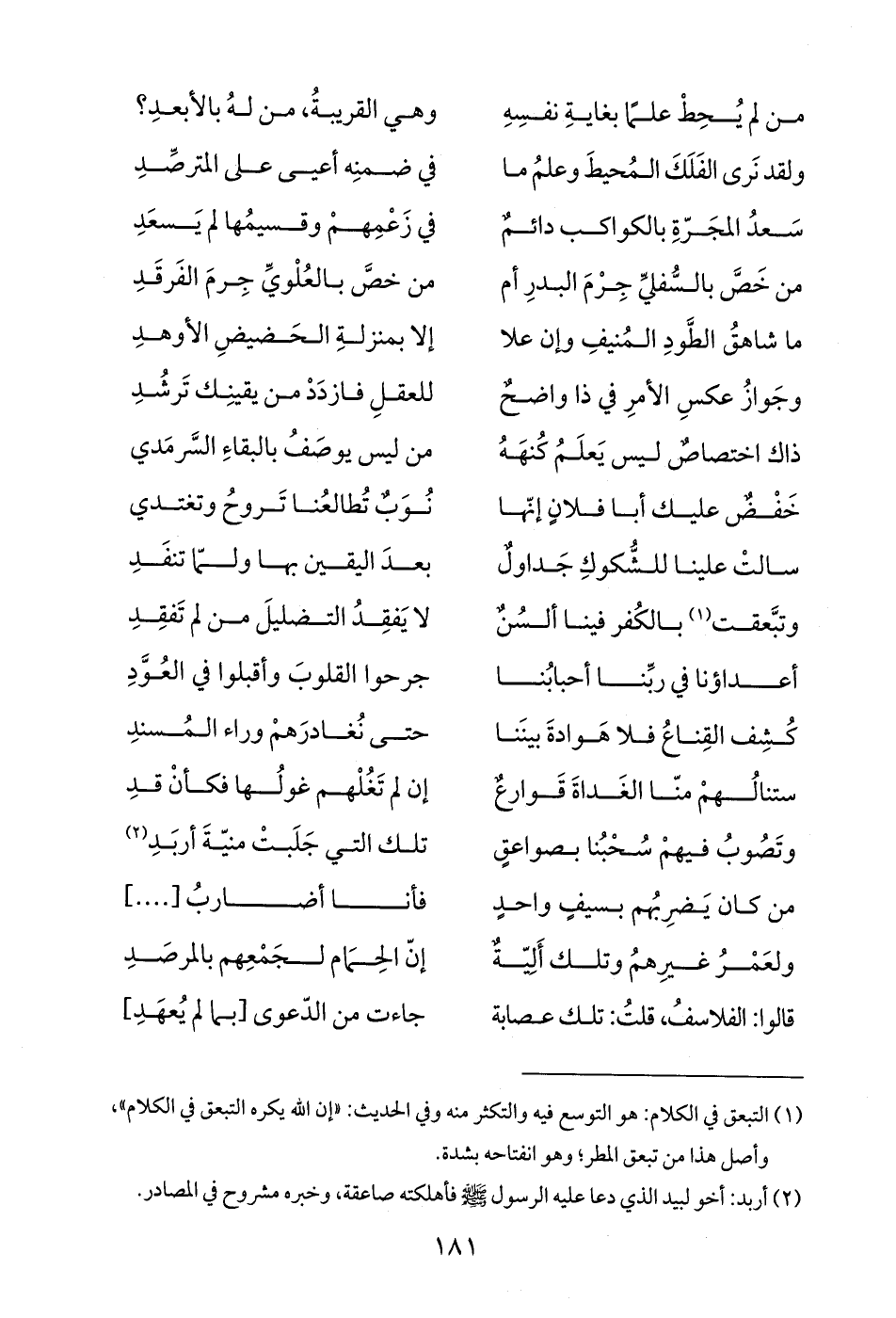 قالوا: الفلاسفُ، قلتُ: تلك عصابة ... جاءت من الدّعوى [بما لم يُعهَدِ]