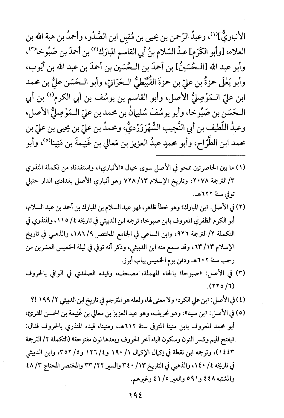 (¬1) ما بين الحاصرتين ممحو في الأصل سوى خيال "الأنباري"، واستفدناه من تكملة المنذري 3/الترجمة 2078، وتاريخ الإسلام 13/ 728 وهو أنباري الأصل بغدادي الدار حنبلي توفي سنة 622 هـ.