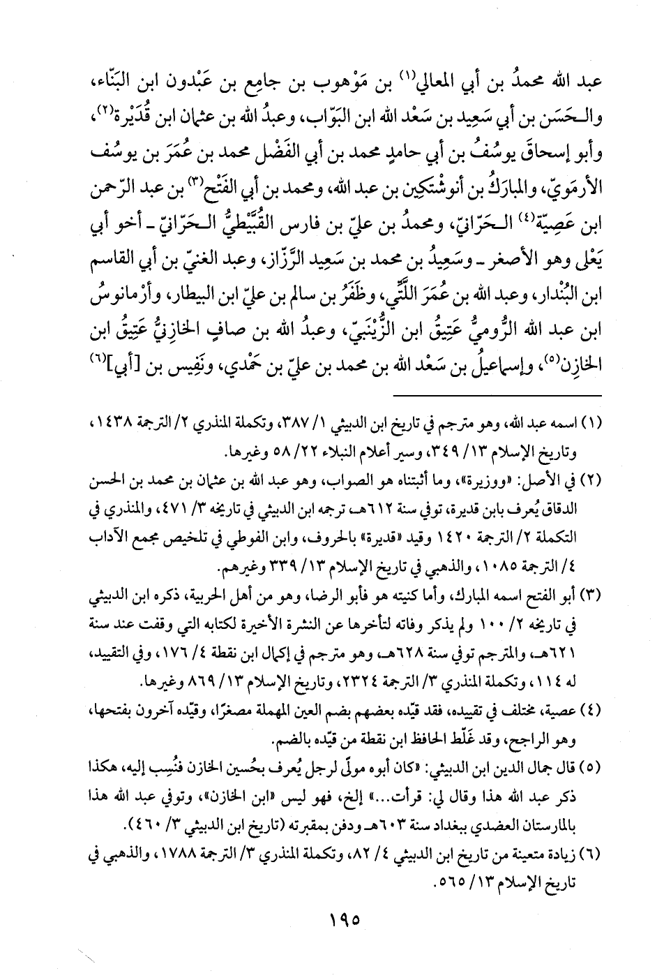 (¬5) قال جمال الدين ابن الدبيثي: "كان أبوه مولًى لرجل يُعرف بحُسين الخازن فنُسِب إليه، هكذا ذكر عبد الله هذا وقال لي: قرأت ... " إلخ، فهو ليس "ابن الخازن"، وتوفي عبد الله هذا بالمارستان العضدي ببغداد سنة 603 هـ ودفن بمقبرته (تاريخ ابن الدبيثي 3/ 460).