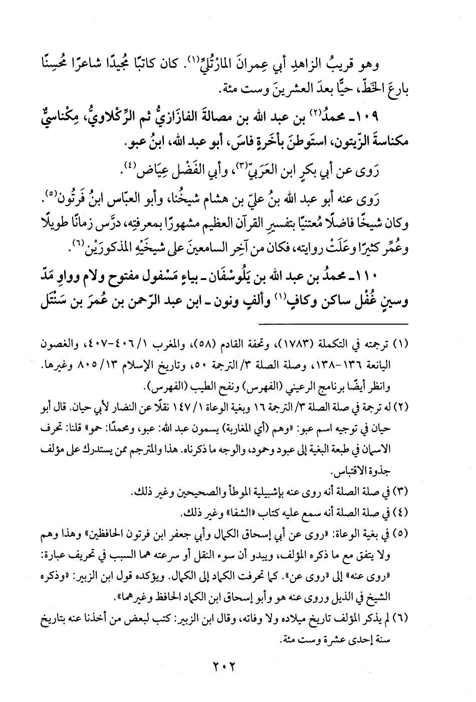 (¬5) في بغية الوعاة: "روى عن أبي إسحاق الكمال وأبي جعفر ابن فرتون الحافظين" وهذا وهم ولا يتفق مع ما ذكره المؤلف، ويبدو أن سوء النقل أو سرعته هما السبب في تحريف عبارة: "روى عنه" إلى "روى عن". كما تحرفت الكماد إلى الكمال. ويؤكده قول ابن الزبير: "وذكره الشَّيخ في الذيل وروى عنه هو وأبو إسحاق ابن الكماد الحافظ وغيرهما".