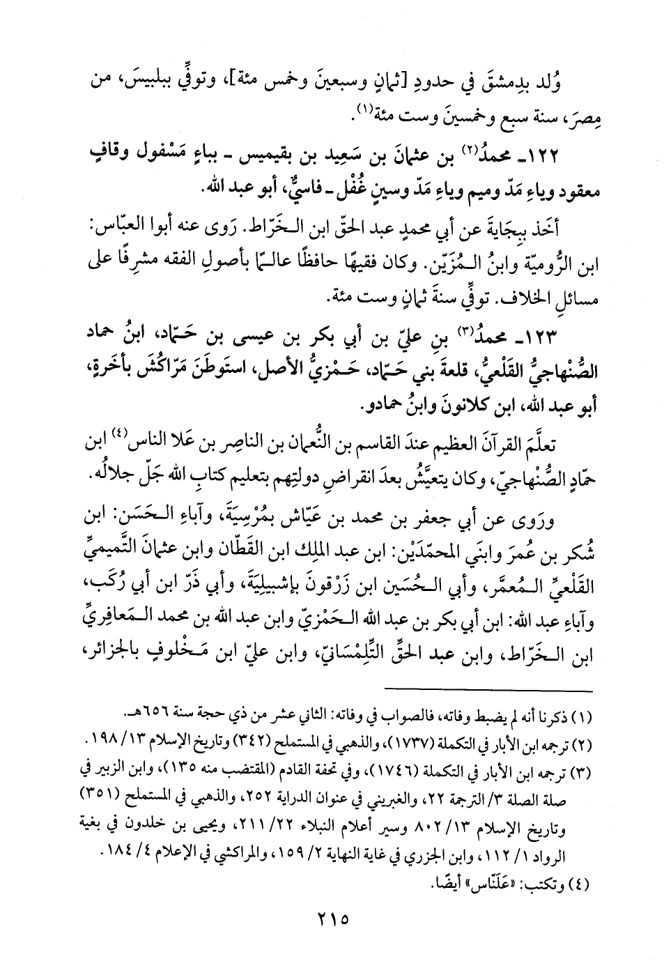 123 - محمدُ (¬3) بنِ عليّ بن أبي بكر بن عيسى بن حَّماد، ابنُ حماد الصُّنْهاجيُّ القَلْعيُّ، قلعةَ بني حَّماد، حَمْزيُّ الأصل، استَوطَنَ مَرّاكُشَ بأخَرةٍ، أبو عبد الله، ابن كلانونَ وابنُ حمادو.