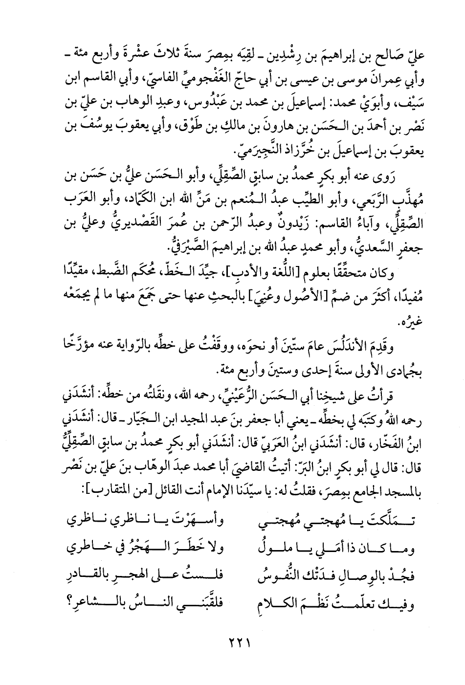 قرأتُ على شيخِنا أبي الحَسَن الرّعَيْنيِّ، رحمه الله، ونقَلتُه من خطِّه: أنشَدَني رحمه اللهُ وكتبَه لي بخطِّه -يعني أَبا جعفر بنَ عبد المجيد ابن الجَيّار- قال: أنشَدَني ابنُ الفَخّار، قال: أنشَدَني ابنُ العَرَبيّ قال: أنشَدَني أبو بكرٍ محمدُ بن سابقٍ الصِّقِلِّيُّ قال: قال لي أبو بكرٍ ابنُ البَرّ: أتيتُ القاضيَ أَبا محمد عبدَ الوهّاب بنَ عليّ بن نَصْر بالمسجد الجامع بمِصرَ، فقلتُ له: يَا سيّدَنا الإِمام أَنْتَ القائل [من المتقارب]: