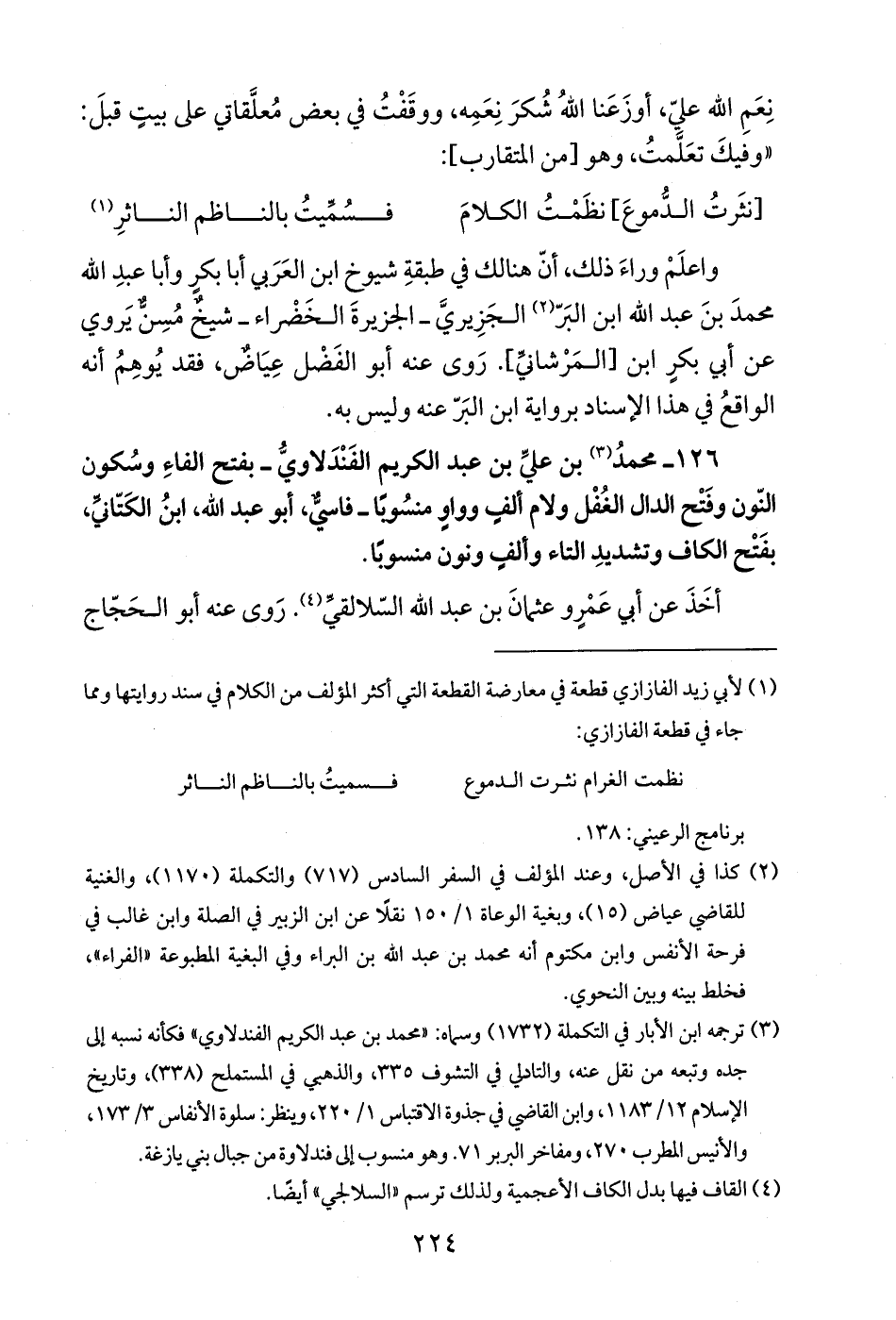 (¬3) ترجمه ابن الأبار في التكملة (1732) وسماه: "محمد بن عبد الكريم الفندلاوي" فكأنه نسبه إلى جده وتبعه من نقل عنه، والتادلي في التشوف 335، والذهبي في المستملح (338)، وتاريخ الإسلام 12/ 1183، وابن القاضي في جذوة الاقتباس 1/ 220، وينظر: سلوة الأنفاس 3/ 173، والأنيس المطرب 270، ومفاخر البربر 71. وهو منسوب إلى فندلاوة من جبال بني يازغة.