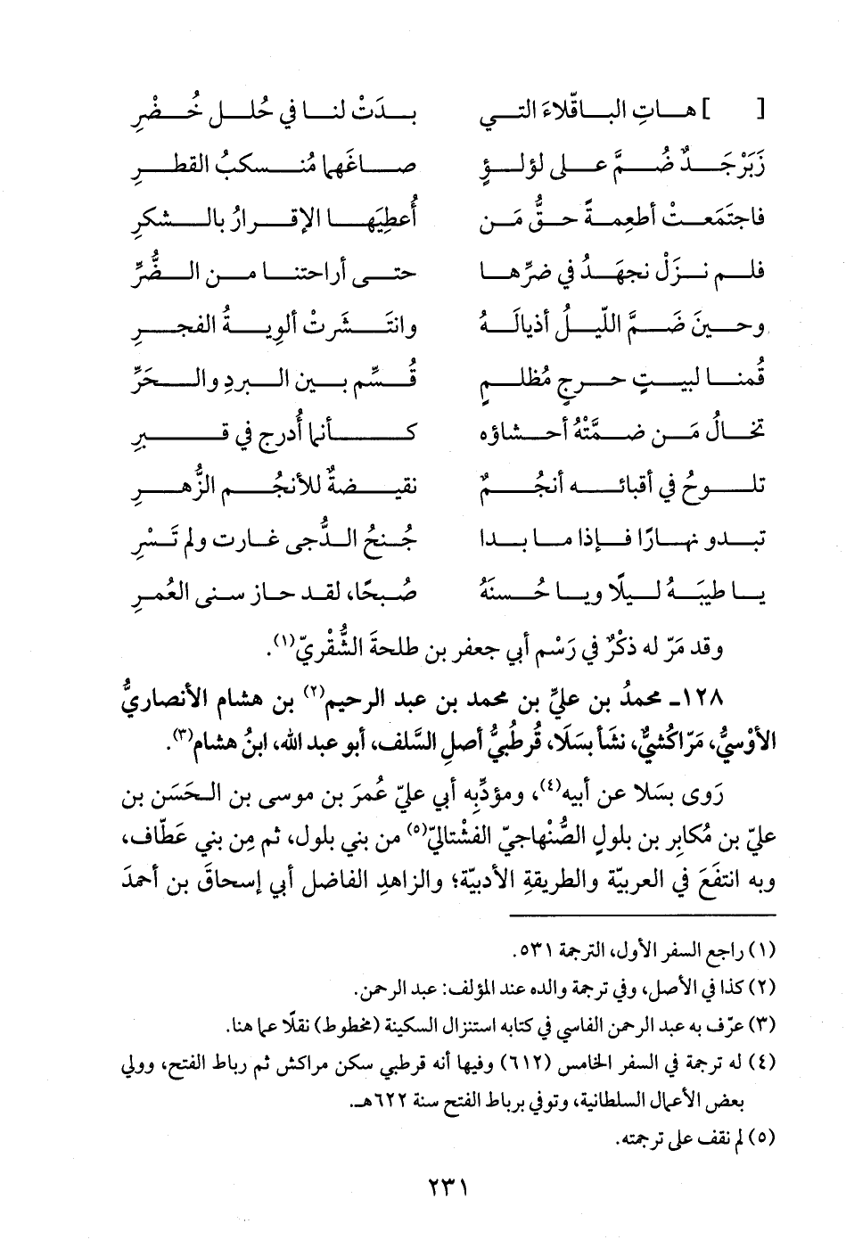 128 - محمدُ بن عليِّ بن محمد بن عبد الرحيم (¬2) بن هشام الأَنْصاريُّ الأوْسيُّ، مَرّاكشيٌّ، نشَأ بسَلَا، قُرطُبيُّ أصلِ السَّلف، أبو عبد الله، ابنُ هشام (¬3).