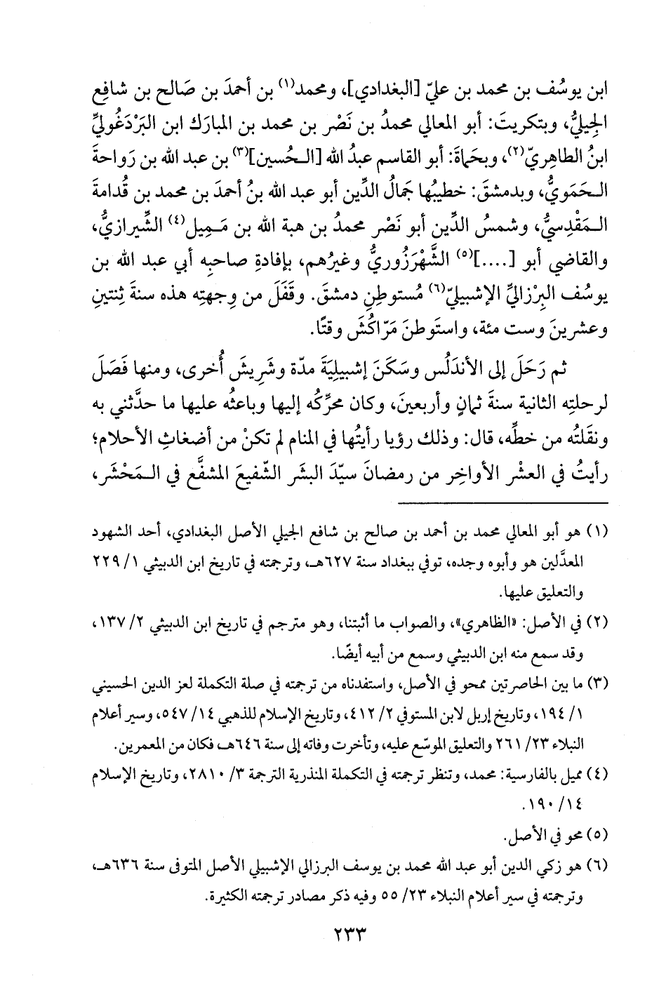 (¬6) هو زكي الدين أبو عبد الله محمد بن يوسف البرزالي الإشبيلي الأصل المتوفى سنة 636 هـ، وترجمته في سير أعلام النبلاء 23/ 55 وفيه ذكر مصادر ترجمته الكثيرة.