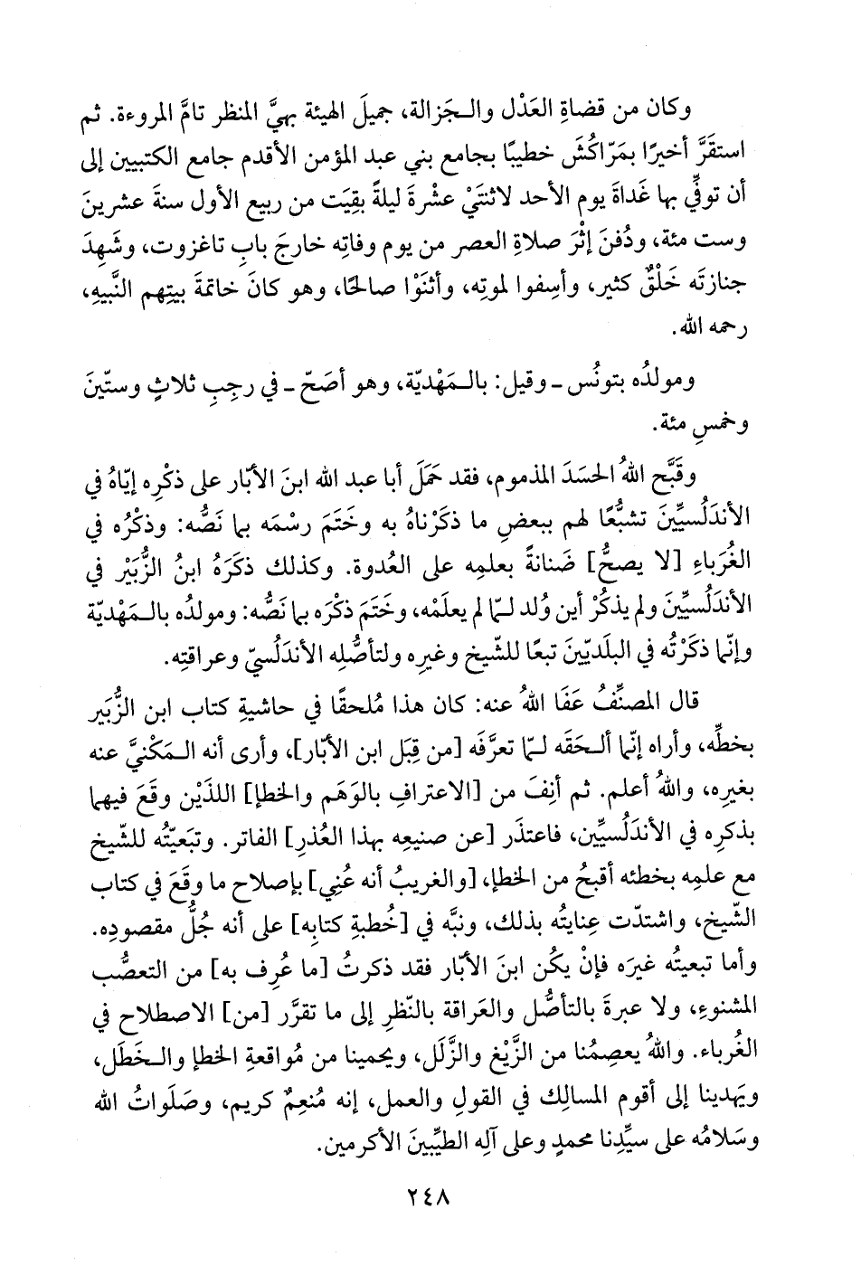 وأما تبعيتُه غيرَه فإنْ يكُن ابنَ الأبّار فقد ذكرتُ [ما عُرِف به] من التعصُّب المشنوءِ، ولا عبرةَ بالتأصُّل والعَراقة بالنّظرِ إلى ما تقرَّر [من] الاصطلاح في الغُرباء. واللهُ يعصِمُنا من الزَّيْغ والزَّلَل، ويحمينا من مُواقعةِ الخطإ والخَطَل، ويَهدينا إلى أقوم المسالِك في القولِ والعمل، إنه مُنعِمٌ كريم، وصَلَواتُ الله وسَلامُه على سيِّدِنا محمدٍ وعلى آلِه الطيِّبينَ الأكرمين.