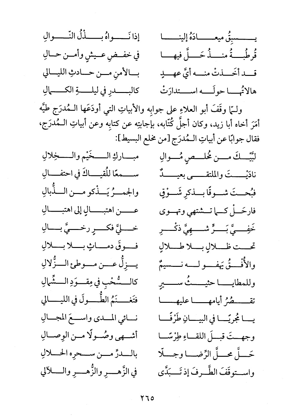 ولمّا وقَفَ أبو العلاءِ على جوابِه والأبياتِ التي أودَعَها المُدرَج طيَّه أمَرَ أخاه أبا زَيْد، وكان أجلَّ كُتّابه، بإجابتِه عن كتابِه وعن أبياتِ المُدرَج، فقال جوابًا عن أبياتِ المُدرَج [من مخلع البسيط]: