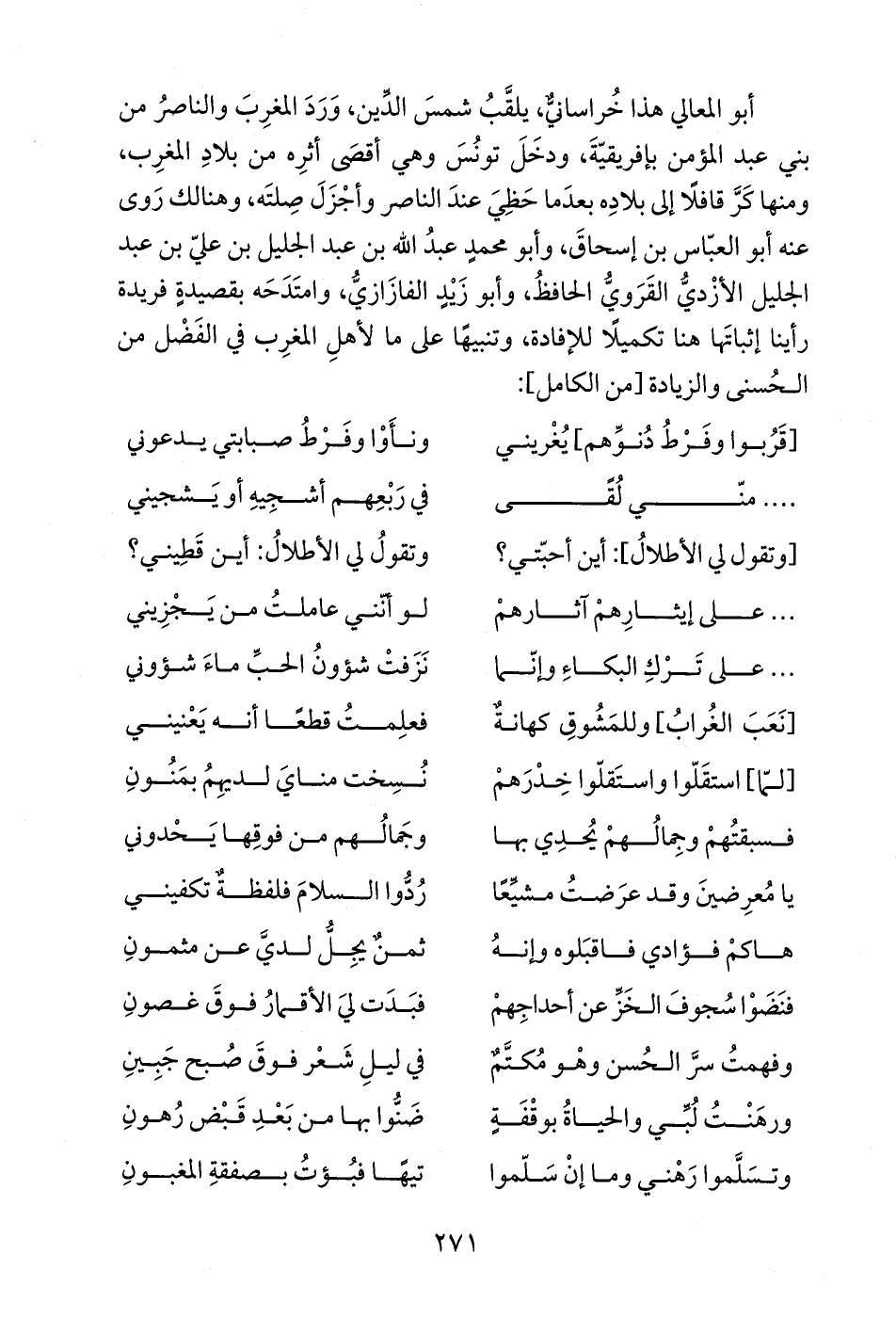 أبو المعالي هذا خُراسانيٌّ، يلقَّبُ شمسَ الدّين، وَرَدَ المغرِبَ والناصرُ من بني عبد المؤمن بإفريقيّةَ، ودخَلَ تونُسَ وهي أقصَى أثرِه من بلادِ المغرِب، ومنها كَرَّ قافلًا إلى بلادِه بعدَما حَظِيَ عندَ الناصر وأجْزَلَ صِلتَه، وهنالك رَوى عنه أبو العبّاس بن إسحاقَ، وأبو محمدٍ عبد الله بن عبد الجليل بن عليّ بن عبد الجليل الأَزْديُّ القَرَويُّ الحافظُ، وأبو زَيْدٍ الفازَازيُّ، وامتَدَحَه بقصيدةٍ فريدة رأينا إثباتَها هنا تكميلًا للإفادة، وتنبيهًا على ما لأهلِ المغرِب في الفَضْل من الحُسنى والزيادة [من الكامل]: