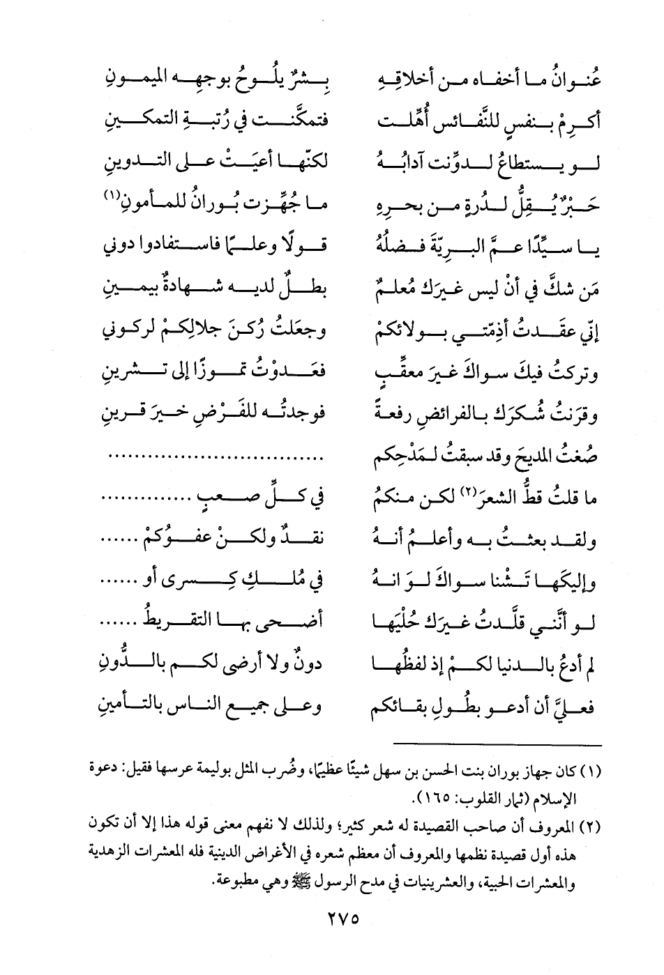 حَبْرٌ يُقِلُّ لدُرةٍ من بحرِهِ ... ما جُهِّزت بُورانُ للمأمونِ (¬1)