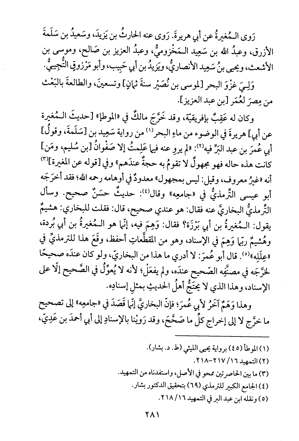وكان له عَقِبٌ بإفريقيّة، وقد خَرَّجَ مالكٌ في "الموطإ" [حديثَ المُغيرة عن أبي، هريرةَ في الوضوء من ماءِ البحر (¬1) من رواية سَعِيد بن [سَلَمةَ، وقولُ] أبي عُمرَ بن عبد البَرِّ فيه (¬2): "لم يروِ عنه فيما عَلِمتُ إلا صَفْوانُ [بن سُليم، ومَن] كانت هذه حالة فهو مجهولٌ لا تقومُ به حجةٌ عندَهم" وفي [قوله عن المغيرة] (¬3) أنه "غيرُ معروف، وقيل: ليس بمجهول" معدودٌ في أوهامه رحمه الله؛ فقد أخرَجَه أبو عيسى التِّرمذيُّ في "جامعِه" وقال (¬4): حديثٌ حسَنٌ صحيح. وسأل التّرمذيُّ البخاريَّ عنه فقال: هو عندي صحيح، قال: فقلت للبخاري: هشيمٌ يقول: المُغيرةُ بن أبي بَرْزَة؟ فقال: وَهِمَ فيه، إنّما هو المُغيرةُ بن أبي بُردة، وهُشيم ربّما وَهِمَ في الإسناد، وهو من المقطَّعاتِ أحفظ، وقَعَ هذا للترمذيِّ في "عِلَلِه" (¬5). قال أبو عُمرَ: لا أدري ما هذا من البخاريّ، ولو كان عندَه صحيحًا لخرَّجَه في مصنَّفِه الصّحيح عندَه، ولم يفعَلْ؛ لأنه لا يُعوِّلُ في الصَّحيح إلّا على الإسناد، وهذا الذي لا يحتَجُّ أهلُ الحديثِ بمثلِ إسنادِه.
