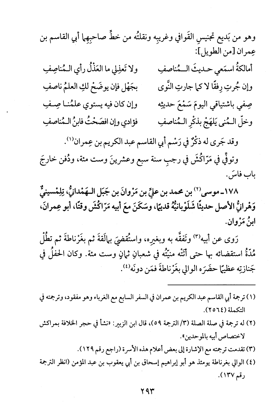 178 - موسى (¬2) بن محمد بن عليّ بن مَرْوانَ بن جَبَل الهَمْدانيُّ، تِلِمْسينيٌّ وَهْرانيُّ الأصل حديثًا شَلَوْبانيُّهُ قديمًا، وسَكَنَ معَ أبيه مَرّاكُشَ وقتًا، أبو عِمرانَ، ابنُ مَرْوان.