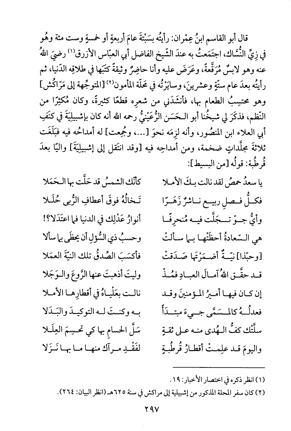 قال أبو القاسم ابنُ عِمْران: رأيتُه بسَبْتةَ عامَ أربعةٍ أو خمسةٍ وست مئة وهُو في زِيِّ النُّسَّاك، اجتَمَعتُ به عندَ الشّيخ الفاضل أبي العبّاس الأزرق (¬1) رضيَ اللهُ عنه وهو لابسٌ مُرَقَّعةً، وعَرَضَ عليه وأنا حاضِرٌ وثيقةً كتبَها في طلاقِه الدّنيا، ثم رأيتُه بعدَ عام ستّةٍ وعشرينَ، وسايَرْتُه في محَلّة المأمون (¬2) [المتوجِّهة إلى مَرّاكُش] وهو محتسِبُ الطعام بها، فأنشَدَني من شعرِه قطعًا كثيرةً، وكان مُكثِرًا من النّظم، فذكَرَ لي شيخُنا أبو الحَسَن الرُّعَيْنيُّ رحمه الله أنه كان بإشبيلِيَةَ في كنَفِ أبي العلاء ابن المنصُور، وأنه لزِمَه نحوَ [... ، وجُمِعت] له أمداحُه فيه فبَلَغَت ثلاثةَ مجلَّداتٍ ضخمة، ومن أمداحِه فيه [وقد انتَقل إلى إشبيلِيَةَ] واليًا بعدَ قُرطُبة: قولُه [من البسيط]: