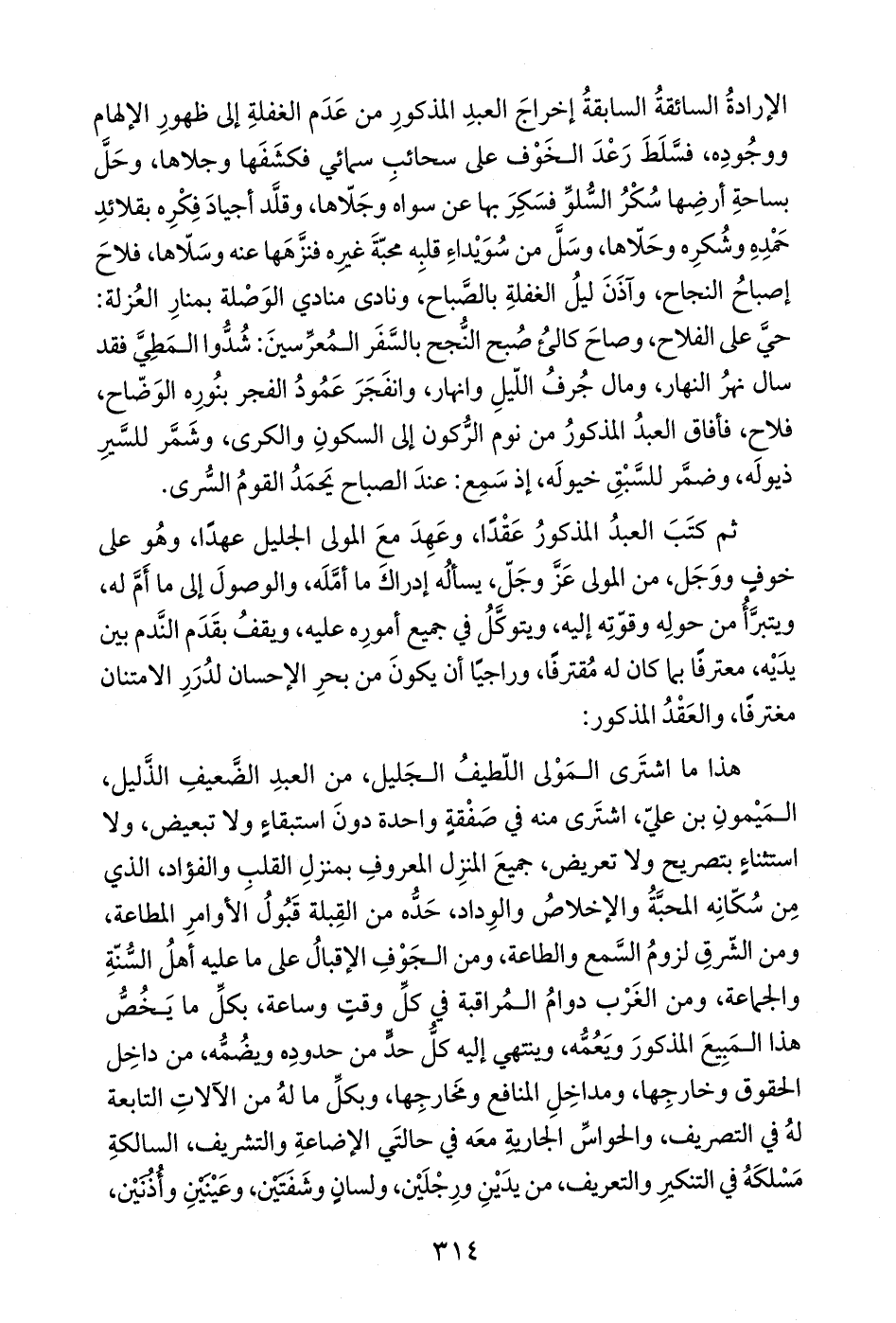 هذا ما اشتَرى المَوْلى اللّطيفُ الجَليل، من العبدِ الضَّعيفِ الذَّليل، المَيْمونِ بن عليّ، اشتَرى منه في صَفْقةٍ واحدة دونَ استبقاءٍ ولا تبعيض، ولا استثناءٍ بتصريح ولا تعريض، جميعَ المنزِل المعروفِ بمنزلِ القلبِ والفؤاد، الذي مِن سُكّانِه المحبَّةُ والإخلاصُ والوِداد، حَدُّه من القِبلة قَبُولُ الأوامرِ المطاعة، ومن الشّرقِ لزومُ السَّمع والطاعة، ومن الجَوْفِ الإقبالُ على ما عليه أهلُ السُّنّةِ والجماعة، ومن الغَرْب دوامُ المُراقبة في كلِّ وقتٍ وساعة، بكلِّ ما يَخُصُّ هذا المَبِيعَ المذكورَ وَيعُمُّه، وينثهي إليه كلُّ حدٍّ من حدودِه ويضُمُّه، من داخِل الحقوق وخارجِها، ومداخِلِ المنافع ومخَارجِها، وبكلِّ ما لهُ من الآلاتِ التابعة لهُ في التصريف، والحواسِّ الجاريةِ معَه في حالتَي الإضاعةِ والتشريف، السالكةِ مَسْلكَهُ في التنكيرِ والتعريف، من يدَيْنِ ورِجْلَيْن، ولسانٍ وشَفَتْين، وعَيْنيْنِ وأُذُنيْن،