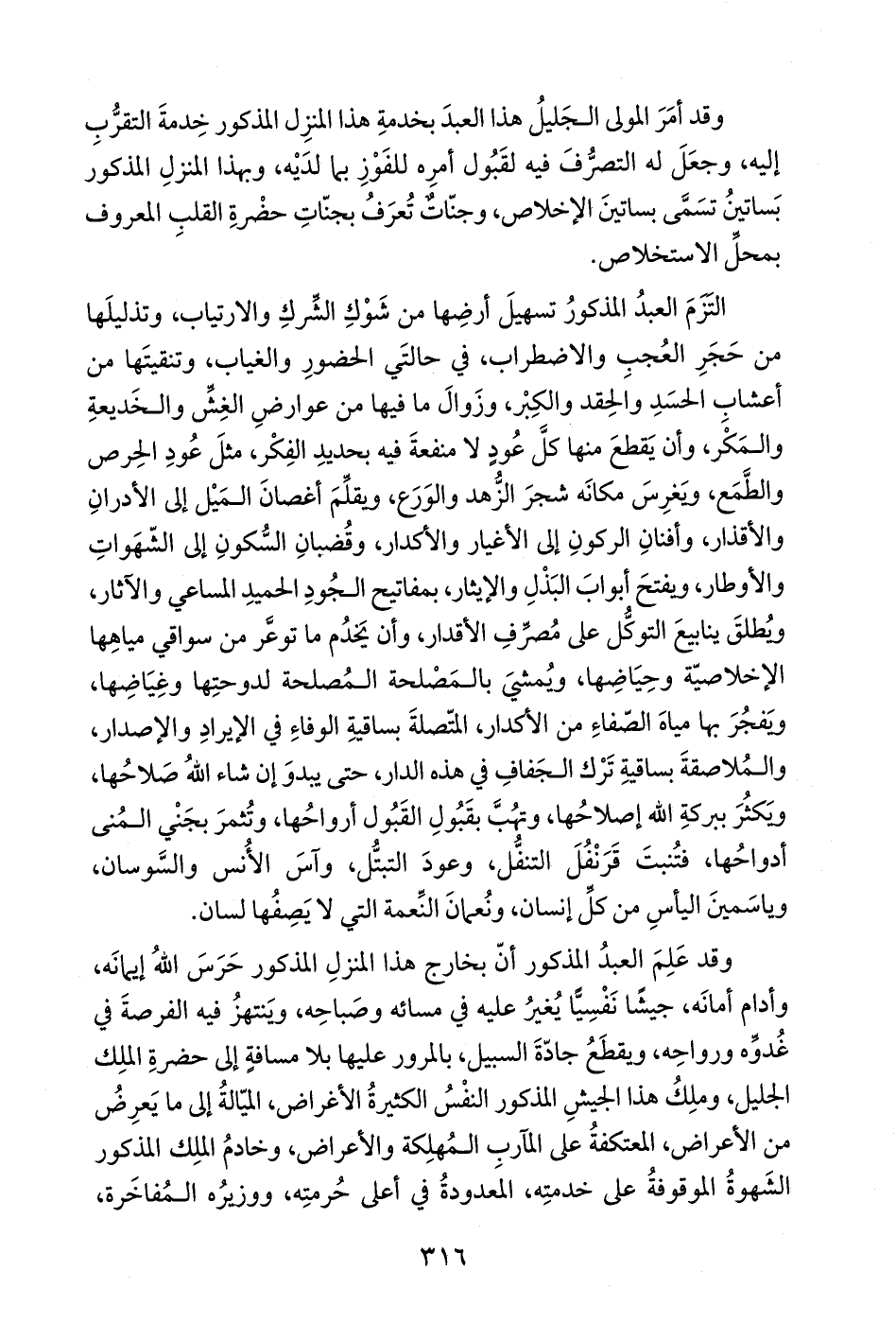 وقد أمَرَ المولى الجَليلُ هذا العبدَ بخدمةِ هذا المنزِل المذكور خِدمةَ التقرُّبِ إليه، وجعَلَ له التصرُّفَ فيه لقَبُول أمرِه للفَوْزِ بما لدَيْه، وبهذا المنزلِ المذكور بَساتينُ تسَمَّى بساتينَ الإخلاص، وجنّاتٌ تُعرَفُ بجنّاتِ حضْرةِ القلبِ المعروف بمحلِّ الاستخلاص.