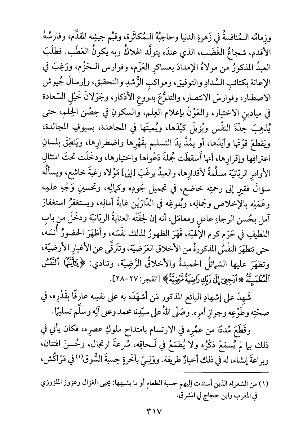 وزِمامُه المُنافسةُ في زَهرةِ الدنيا وحاجبُهُ المُكاثَرة، وقيِّم جيشِه المقدَّم، وفارسُهُ الأقدم، شجاعُ الغَضَب، الذي عندَه يتولَّد الهلاكُ وبه يكونُ العَطَب. فطلَبَ العبدُ المذكورُ من مولاهُ الإمدادَ بعساكرِ العَزْم، وفوارس الحَزْم، ورَغِبَ في الإعانة بكتائبِ السَّدادِ والتوفيق، ومواكبِ الرُّشدِ والتحقيق، وإرسالَ جُيوش الاصطبار، وفوارسَ الانتصار، والتدرُّعَ بدروعِ الأذكار، وجَوَلانَ خَيْلِ السّعادة في ميادينِ الاختيار، والعَوْنَ بإعلام العِلم، والسكونِ في حِصْن الحِلم، حتى يُذهِبَ حِدّةَ النفْس ويُزيلَ كيْدَها، ويُميتَها في المجاهدة، بسيوفِ المجالدة، وَيقطعَ قوّتَها وأيْدَها، أو يمُدَّ يدَ التسليم بقَهْرِها واضطرارِها، ويَنطِقَ بلسانِ اعترافِها وإقرارِها، أنها أَسقطَت جُملةَ دَعْواها واختيارها، ودخَلَت تحتَ امتثالِ الأوامرِ الربّانيّة مسلّمةً لأقدارِها، والعبدُ يرغَبَ [إلى] مَوْلاه رغبةَ خاشع، ويسألُه سؤالَ فقيرٍ إلى رحمتِه خاضع، في تجميل جُودِه وكمالِه، وتحسينِ وَجْهِ علمِه وعَمَلِه بالإخلاص وجَمالِه، وبُلوغِه في الدّارَيْن غايةَ آمالِه، ويستغفرُ استغفارَ آمل بحُسن الرجاءِ عاملٍ ومعامَل، أنه إن لحِقَتْه العنايةُ الربّانيّة ودخَلَ من بابِ اللطيفِ في حَرَم كرم الإلهيّة، قَهَرَ الظهورُ لذلك نفْسَه، وأظهَرَ الحضورُ أُنسَه، حتى تتطهّرَ النفْسُ المذكورةُ من الأخلاق العَرَضيّة، وتتَرقَّى عن الأغيارِ الأرضيّة، وتظهَرَ عليها الشمائلُ الحميدةُ والأخلاقُ الرَّضِيّة، وتنادي: {يَاأَيَّتُهَا النَّفْسُ الْمُطْمَئِنَّةُ (27) ارْجِعِي إِلَى رَبِّكِ رَاضِيَةً مَرْضِيَّةً} [الفجر: 27 - 28].