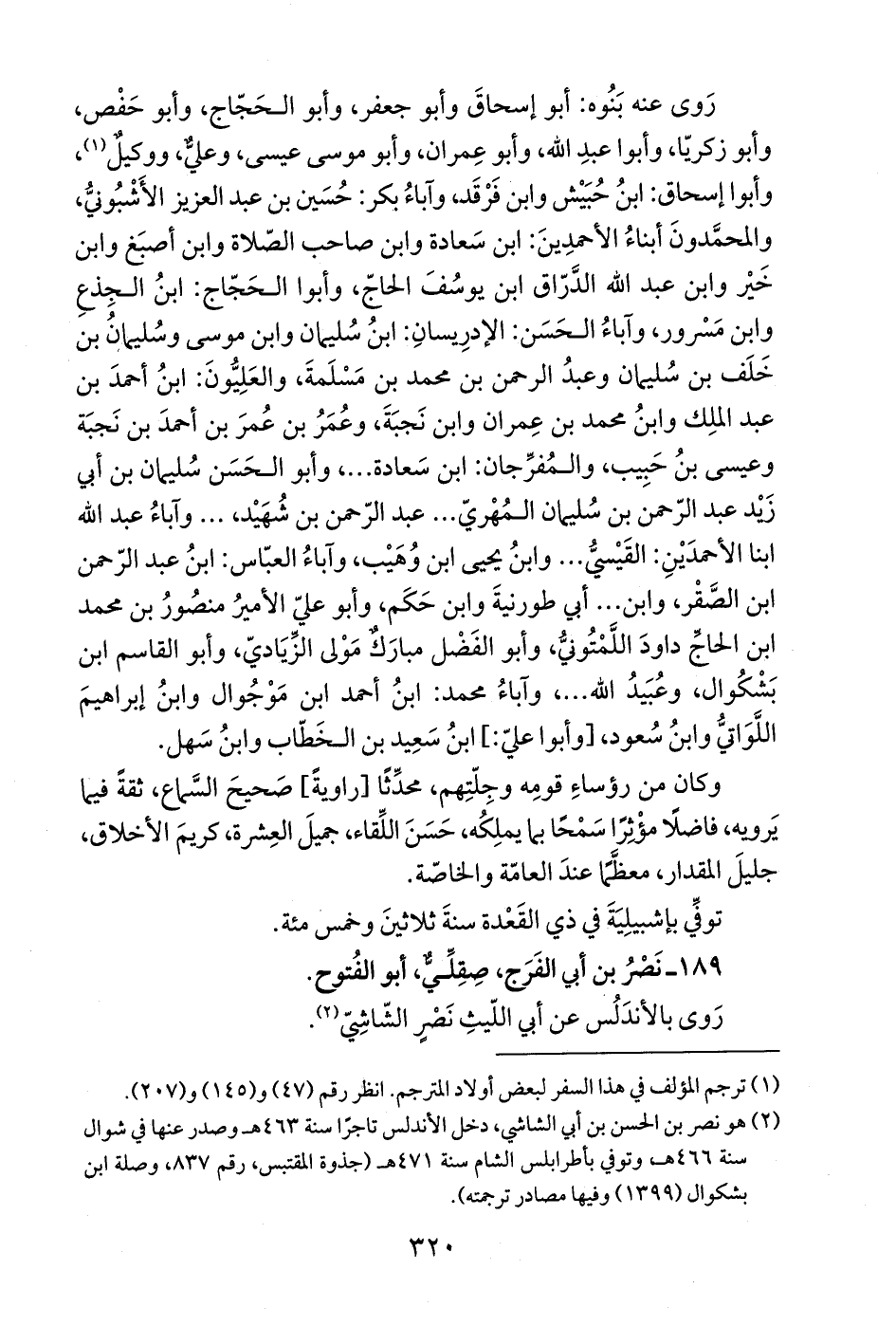 (¬2) هو نصر بن الحسن بن أبي الشاشي، دخل الأندلس تاجرًا سنة 463 هـ وصدر عنها في شوال سنة 466 هـ، وتوفي بأطرابلس الشام سنة 471 هـ (جذوة المقتبس، رقم 837، وصلة ابن بشكوال (1399) وفيها مصادر ترجمته).