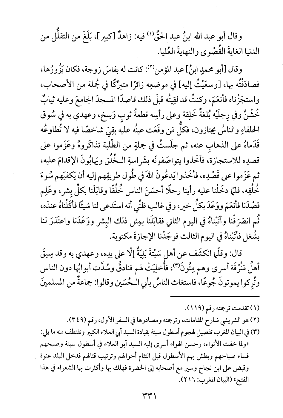 (¬3) في البيان المغرب تفصيل لهجوم أسطول سبتة بقيادة السيد أبي العلاء الكبير ونقتطف منه ما يلي: "ولما خفت الأنواء، وحسن الهواء أسرى إليه السيد أبو العلاء في أسطول سبتة وصبحهم فساء صباحهم وبطش بهم الأسطول قبل التئام أحوالهم وترتيب قتالهم فدخل البلد عنوة وقبض على ابن نجاح وسير مع أصحابه إلى الحضرة فهلك بها وأكثرت بها الشعراء في هذا الفتح" (البيان المغرب: 216).