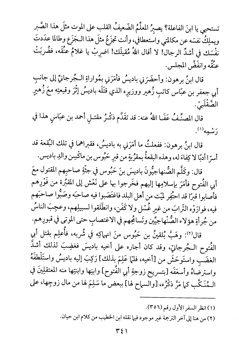 قال ابنُ برهون: وأحضَرَني باديسُ فأمَرَني بمُواراةِ الجُرجانيِّ إلى جانبِ أبي جعفر بن عبّاس كاتبِ زُهير ووزيرِه الذي قتَلَه باديسُ إثْرَ وقيعتِه معَ زُهيرٍ الصَّقْلَبيّ.