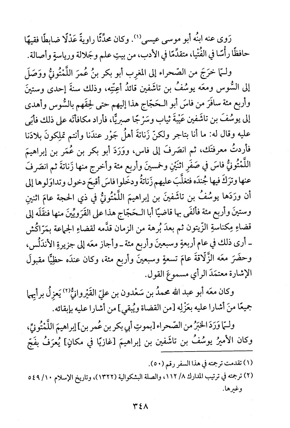 ولمّا خرَجَ من الصحراء إلى المغرِب أبو بكر بنُ عُمرَ اللَّمْتُونيُّ ووَصَلَ إلى السُّوس ومعَه يوسُفُ بن تاشَفين قائدُ أعِنّتِه، وذلك سنةَ إحدى وستينَ وأربع مئة سافَرَ من فاسَ أبو الحَجّاج هذا إليهم حتى لحِقَهم بالسُّوس وأهدى إلى يوسُفَ بن تاشَفين عَيْبةَ ثياب وسَرْجًا صبريًّا، فأراد مكافأتَه على ذلك فأبَى عليه وقال له: ما أنا بتاجر ولكنّ زَناتةَ أهلُ جَوْر عندَنا وأنتم تملِكونَ بلادَنا فأردتُ معرفتَك، ثم انصَرفَ إلى فاس، ووَرَدَ أبو بكر بن عُمَر بن إبراهيمَ اللَّمْتُونيُّ فاسَ في صَفَرِ اثنَيْنِ وخمسينَ وأربع مئة وأخرج منها زَناتةَ ثم انصَرفَ عنها وترَكَ فيها جُندَه فتغلَّبَ عليهم زَناتةُ ودخَلوا فاسَ أقبحَ دخول وتداوَلوها إلى أن ورَدَها يوسُفُ بن تاشَفينَ بن إبراهيمَ اللَّمْتُونيُّ في ذي الحجة عامَ اثنينِ وستينَ وأربع مئة فألفَى بها قاضيًا أبا الحَجّاج هذا على القَرَويِّينَ منها فنقَلَه إلى قضاءِ مِكناسةِ الزّيتون ثم بعدَ بُرهة من الزمان قدَّمه لقضاءِ الجماعة بمَرّاكُش -أرى ذلك في عام أربعةٍ وسبعينَ وأربع مئة- وأجاز معَه إلى جزيرةِ الأندَلُس، وحضَرَ معَه الزَّلّاقةَ عامَ تسعةٍ وسبعينَ وأربع مئة، وكان عندَه حظِيًّا مقبولَ الإشارة معتمَدَ الرأي مسموعَ القول.