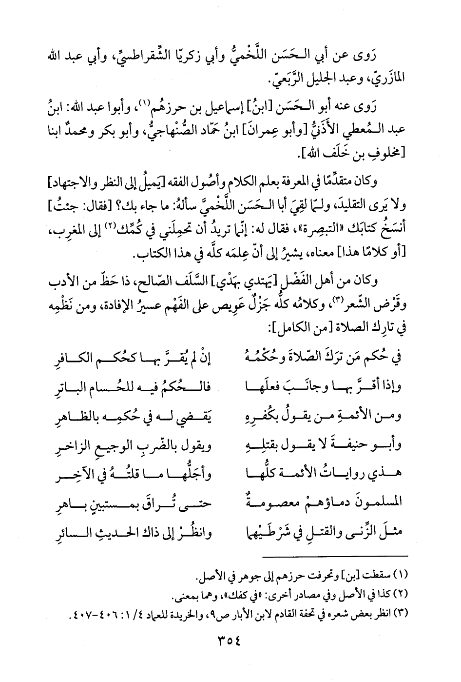 وكان متقدِّمًا في المعرفة بعلم الكلام وأصُول الفقه [يَميلُ إلى النظر والاجتهاد] ولا يَرى التقليدَ، ولمّا لقِيَ أبا الحَسَن اللَّخْميَّ سألهُ: ما جاء بك؟ [فقال: جئتُ] أنسَخُ كتابَك "التبصِرة"، فقال له: إنّما تريدُ أن تحمِلَني في كُمِّك (¬2) إلى المغرِب، [أو كلامًا هذا] معناه، يشيرُ إلى أنّ عِلمَه كلَّه في هذا الكتاب.