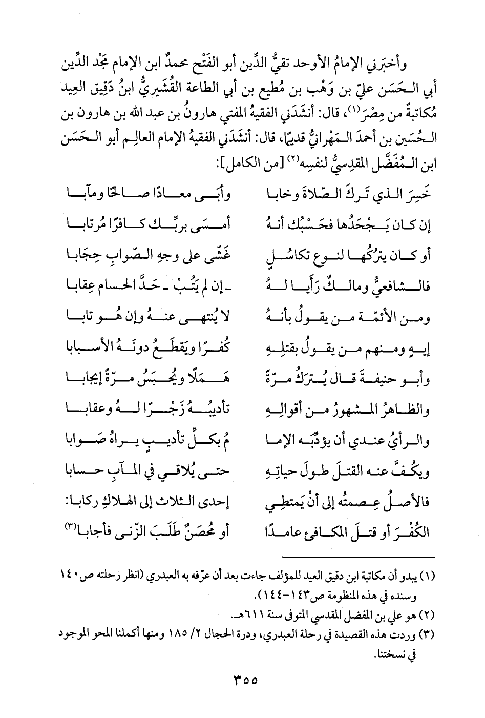 وأخبَرني الإمامُ الأوحد تقيُّ الدِّين أبو الفَتْح محمدٌ ابن الإمام مَجْد الدِّين أبي الحَسَن عليّ بن وَهْب بن مُطيع بن أبي الطاعة القُشَيريُّ ابنُ دَقِيق العِيد مُكاتبةً من مِصْرَ (¬1)، قال: أنشَدَني الفقيهُ المفتي هارونُ بن عبد الله بن هارون بن الحُسَين بن أحمدَ المَهْرانيُّ قديمًا، قال: أنشَدَني الفقيهُ الإمام العالِم أبو الحَسَن ابن المُفَضَّل المقدِسيُّ لنفسِه (¬2) [من الكامل]: