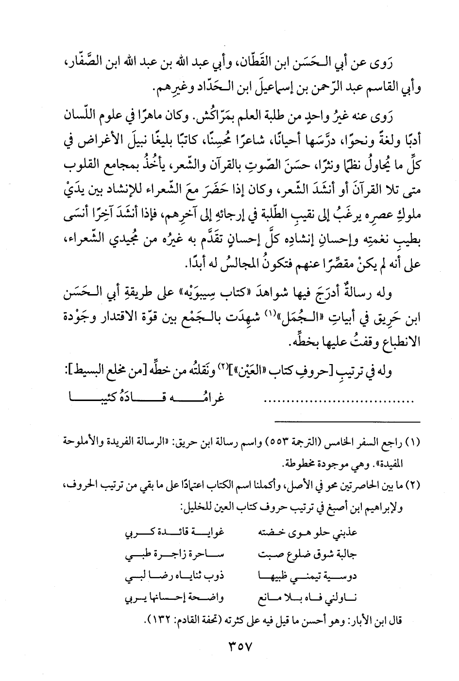 وله في ترتيبِ [حروفِ كتاب "العَيْن"] (¬2) ونَقلتُه من خطِّه [من مخلع البسيط]: