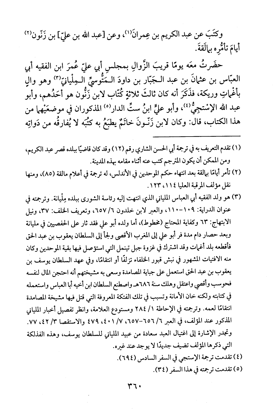 (¬3) هو ولد الفقيه أبي العباس الملياني الذي انتهت إليه رئاسة الشورى ببلده مِلْيانة. وترجمته في عنوان الدراية: 109 - 110، والعبر لإبن خلدون 6/ 657، وتعريف الخلف: 37، ونيل الابتهاج: 63 وكفاية المحتاج (مخطوط)، أما ولده أبو علي فقد ثار على الحفصيين في مليانة وبعد حصار دام مدة فر أبو علي إلى المغرب الأقصي ولجأ إلى السلطان يعقوب بن عبد الحق فأقطعه بلد أغمات وقد اشترك في غزوة جبل تينمل التي استؤصل فيها بقية الموحدين وكان منه الافتيات المشهور في نبش قبور الخلفاء تزلفًا أو انتقامًا، وفي عهد السلطان يوسف بن يعقوب بن عبد الحق استعمل على جباية المصامدة وسعى به مشيختهم أنه احتجن المال لنفسه فحوسب وأقصي واعتقل وهلك سنة 686 هـ واصطنع السلطان ابن أخيه أبا العباس واستعمله في كتابته ولكنه خان الأمانة وتسبب في تلك الفتكة المعروفة التي قتل فيها مشيخة المصامدة انتقامًا لعمه. وترجمته في الإحاطة 1/ 284 ومستودع العلامة، وانظر تفصيل أخبار الملياني المذكور عند المؤلف، في العبر 6/ 656 - 657، 7/ 401، 479 والاستقصا 3/ 42، 77. وتجدر الإشارة إلى اغتيال العبد سعادة من عبيد الملياني للسلطان يوسف، وهذه الفذلكة التي ذكرها المؤلف تضيف جديدًا لا يوجد عند غيره.