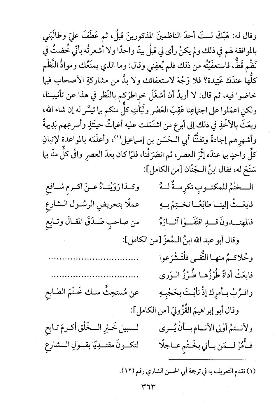 وقال له: هَبْكَ لستَ أحدَ الناظمينَ المذكورينَ قبلُ، ثم عَطَفَ عليّ وطالَبَني بالموافقة لهم في ذلك ولم يكنْ رأى لي قبلُ بيتًا واحدًا ولا أشعرتُه بأنّي خُضتُ في نَظْم قَطُّ، فاستعفَيْتُه من ذلك فلم يُعفِني وقال: وما الذي يمنَعُك وموادُّ النَّظْم كلُّها عندَك عَتِيدة؟ فلا وَجْهَ لاستعفائك ولا بدَّ من مشاركةِ الأصحاب فيما خاضوا فيه، ثم قال: لا أريدُ أن أشغَلَ خواطرَكم بالنّظر في هذا عن تأنيسِنا، ولكنِ اعمَلوا على اجتماعِنا عَقِبَ العَصْر ولْيَأْتِ كلٌّ منكم بما تيسَّر له إن شاء الله، وبعَثَ بالأخْذِ في ذلك إلى أبرع من اشتَمَلت عليه أغماتُ حينَئذٍ وأسرعِهم بَدِيهةً وأشهرِهم إجادةً وتفنُّنًا أبي الحَسَن بن إسماعيل (¬1)، وأعلَمَه بالمواعدة لإتيانِ كلِّ واحدٍ بما عندَه إثْرَ العصر، ثم انصَرَفْنا، فلمّا كان بعدَ العصرِ وافَى كلٌّ منّا بما سَنَحَ له، فقال ابنُ الجَنّان [من الكامل]: