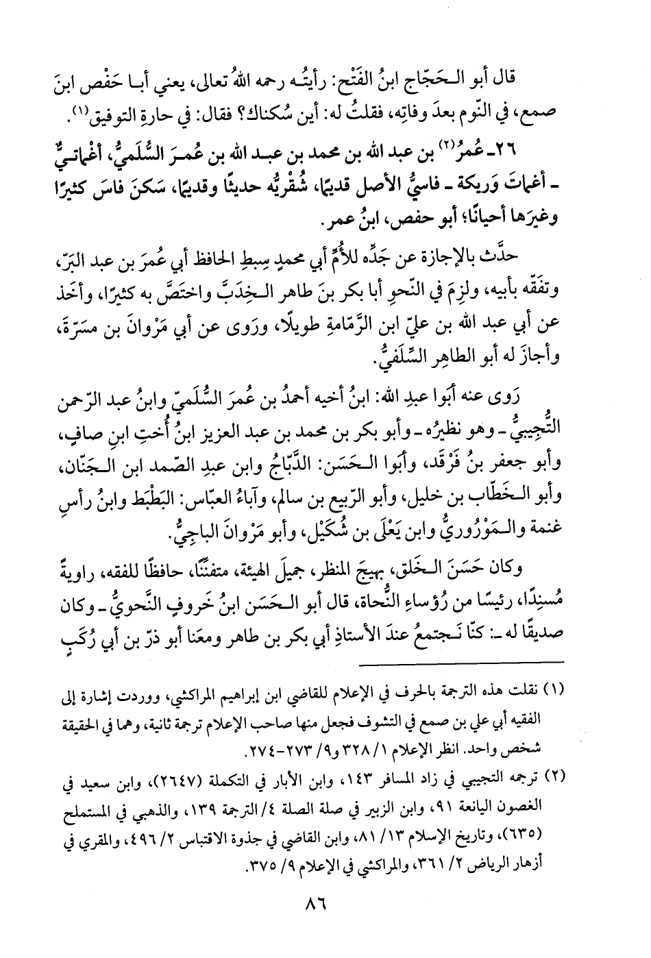 26 - عُمرُ (¬2) بن عبد الله بن محمد بن عبد الله بن عُمرَ السُّلَميُّ، أغْماتيٌّ -أغماتَ وَريكة- فاسيُّ الأصل قديمًا، شُقْريُّه حديثًا وقديمًا، سَكنَ فاسَ كثيرًا وغيرَها أحيانًا؛ أبو حفص، ابنُ عمر.