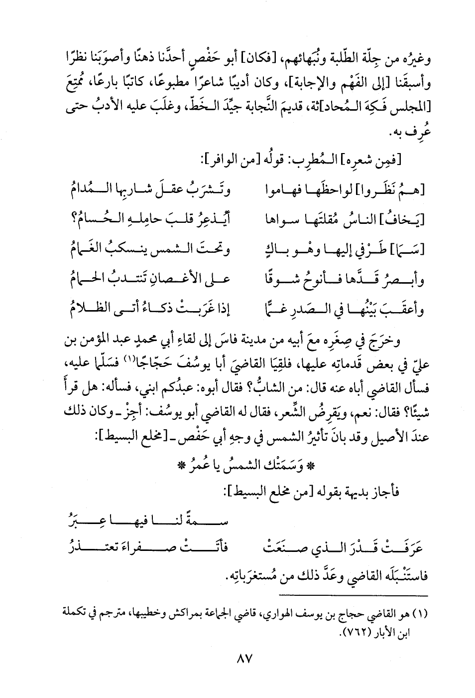 وخرَجَ في صِغَرِه معَ أبيه من مدينة فاسَ إلى لقاءِ أبي محمدٍ عبد المؤمن بن عليّ في بعض قَدماتِه عليها، فلقِيَا القاضيَ أبا يوسُفَ حَجّاجًا (¬1) فسَلّما عليه، فسأل القاضي أباه عنه قال: من الشابُّ؟ فقال أبوه: عبدُكم ابني، فسأله: هل قرأَ شيئًا؟ فقال: نعم، ويَقرِضُ الشِّعر، فقال له القاضي أبو يوسُف: أجِزْ -وكان ذلك عندَ الأصيل وقد بانَ تأثيرُ الشمس في وجهِ أبي حَفْص-[مخلع البسيط]: