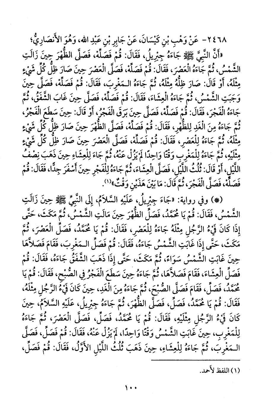 - وفي رواية: «جاء جبريل، عليه السلام، إلى النبي صَلى الله عَليه وسَلم حين زالت الشمس، فقال: قم يا محمد، فصل الظهر حين مالت الشمس، ثم مكث، حتى إذا كان فيء الرجل مثله جاءه للعصر، فقال: قم يا محمد، فصل العصر، ثم مكث، حتى إذا غابت الشمس جاءه، فقال: قم فصل المغرب، فقام فصلاها حين غابت الشمس سواء، ثم مكث، حتى إذا ذهب الشفق جاءه، فقال: قم فصل العشاء، فقام فصلاها، ثم جاءه حين سطع الفجر في الصبح، فقال: قم يا محمد، فصل، فقام فصلى الصبح، ثم جاءه من الغد، حين كان فيء الرجل مثله، فقال: قم يا محمد، فصل، فصلى الظهر، ثم جاءه جبريل، عليه السلام، حين كان فيء الرجل مثليه، فقال: قم يا محمد، فصل، فصلى العصر، ثم جاءه للمغرب، حين غابت الشمس وقتا واحدا، لم يزل عنه، فقال: قم فصل، فصلى المغرب، ثم جاءه للعشاء، حين ذهب ثلث الليل الأول، فقال: قم فصل،