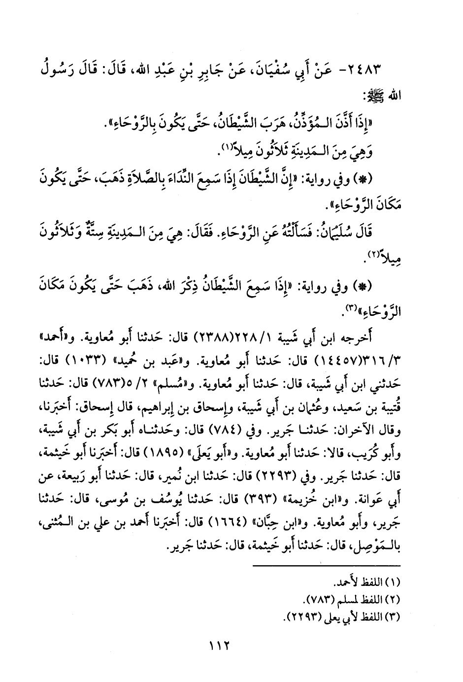 - وفي رواية: «إن الشيطان إذا سمع النداء بالصلاة ذهب، حتى يكون مكان الروحاء».