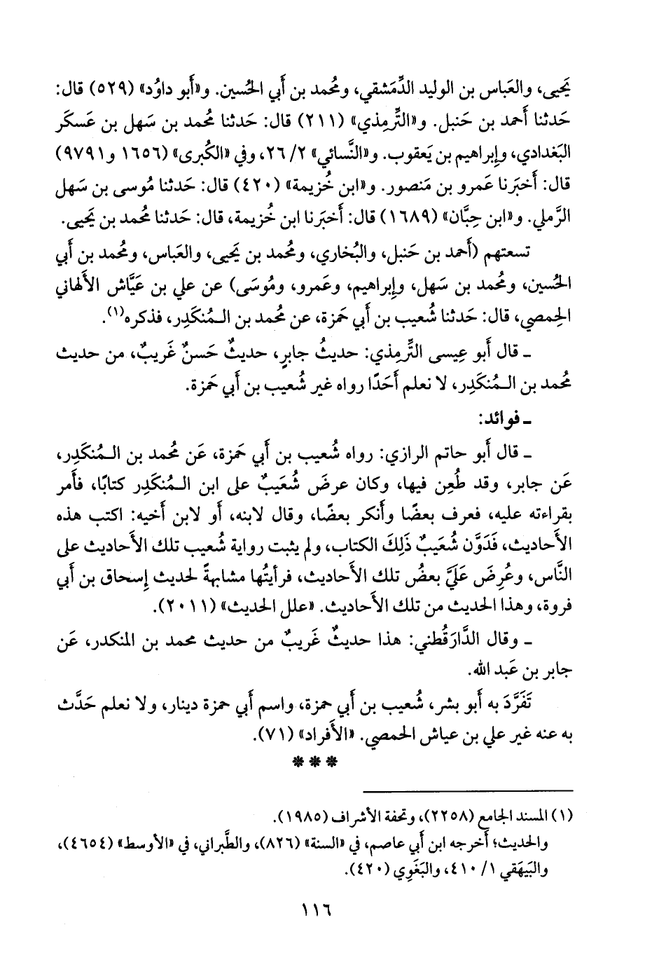 - قال التِّرمِذي: حديث جابر، حديثٌ حسنٌ غريبٌ، من حديث محمد بن المُنكدِر، لا نعلم أحدًا رواه غير شعيب بن أبي حمزة.
